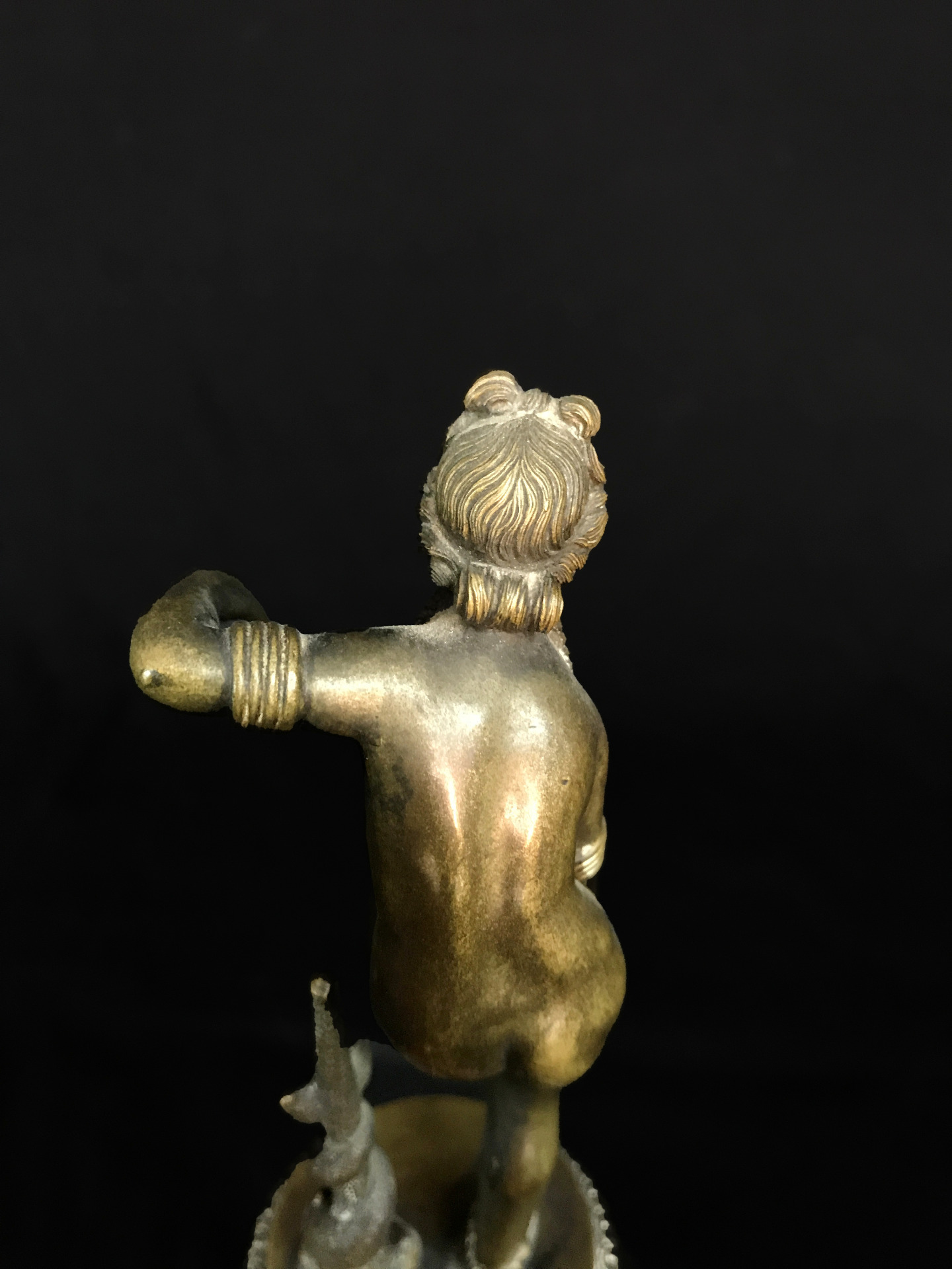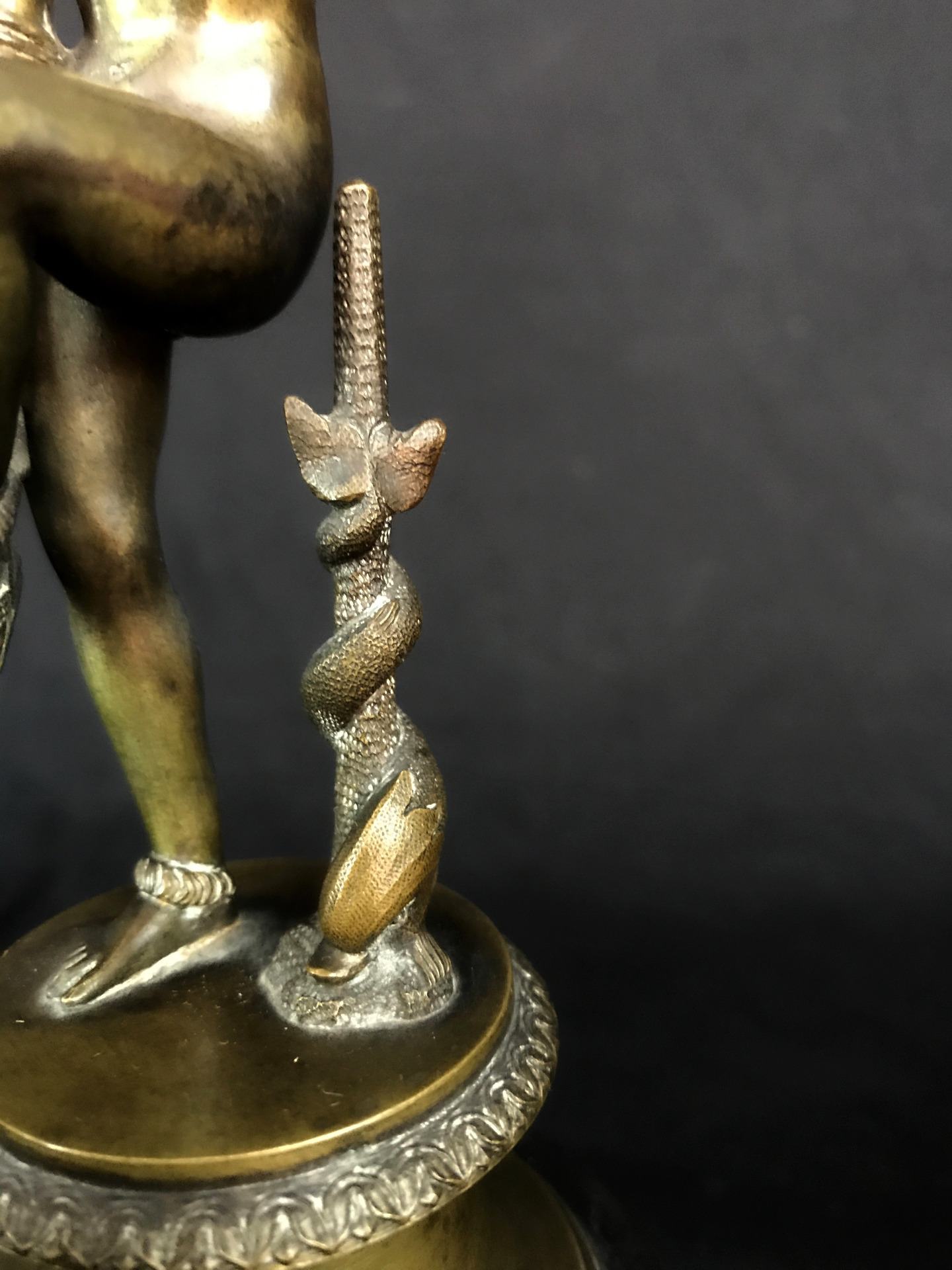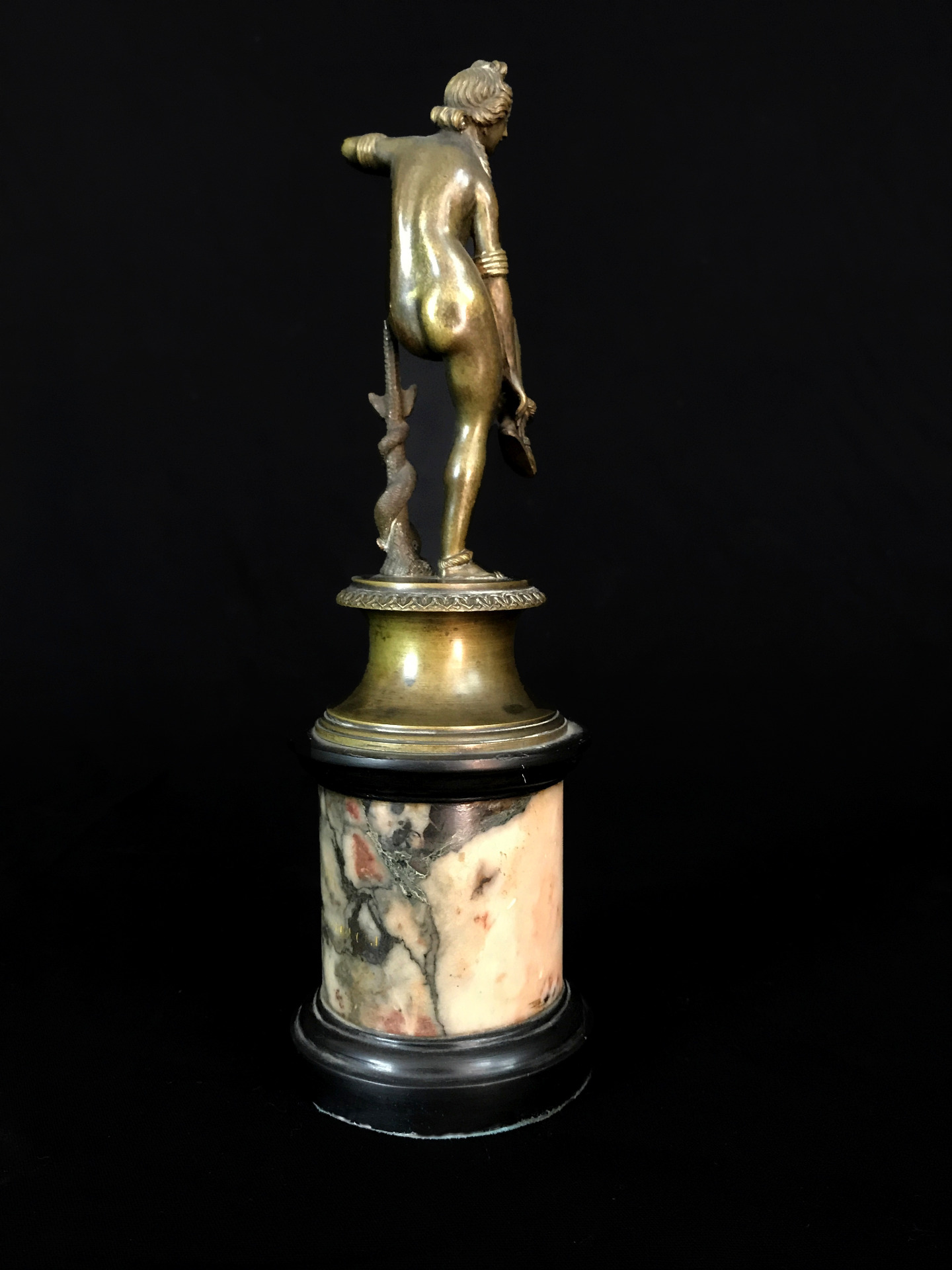 The fortune that this type of depiction had in the following centuries is demonstrated by the vast number of sculptures that represent it. In this bronze work, the goddess resumes the position of the Nude Venus of Oplontis: here Venus holds an apple in her left hand, a reminder of her victory in the beauty contest in which she prevailed over Minerva and Juno by the judgment of Paris. In our bronze instead, the hand seems to want to grasp the apple, which however has not been modeled. Perhaps the bronze is inspired by another work, such as the bronzes kept in the archaeological museum of Padua. Another example is the famous "Venus in bikini" found in Pompeii, so called because it depicts the goddess in the same pose, but with the breasts and hips covered by bands painted in gold. The dolphin depicted next to her could be inspired instead by the Medici Venus, while the hairstyle described is closer to that of the Capitoline Venus: a complex headdress with a high bow knot and strands falling on the shoulders.