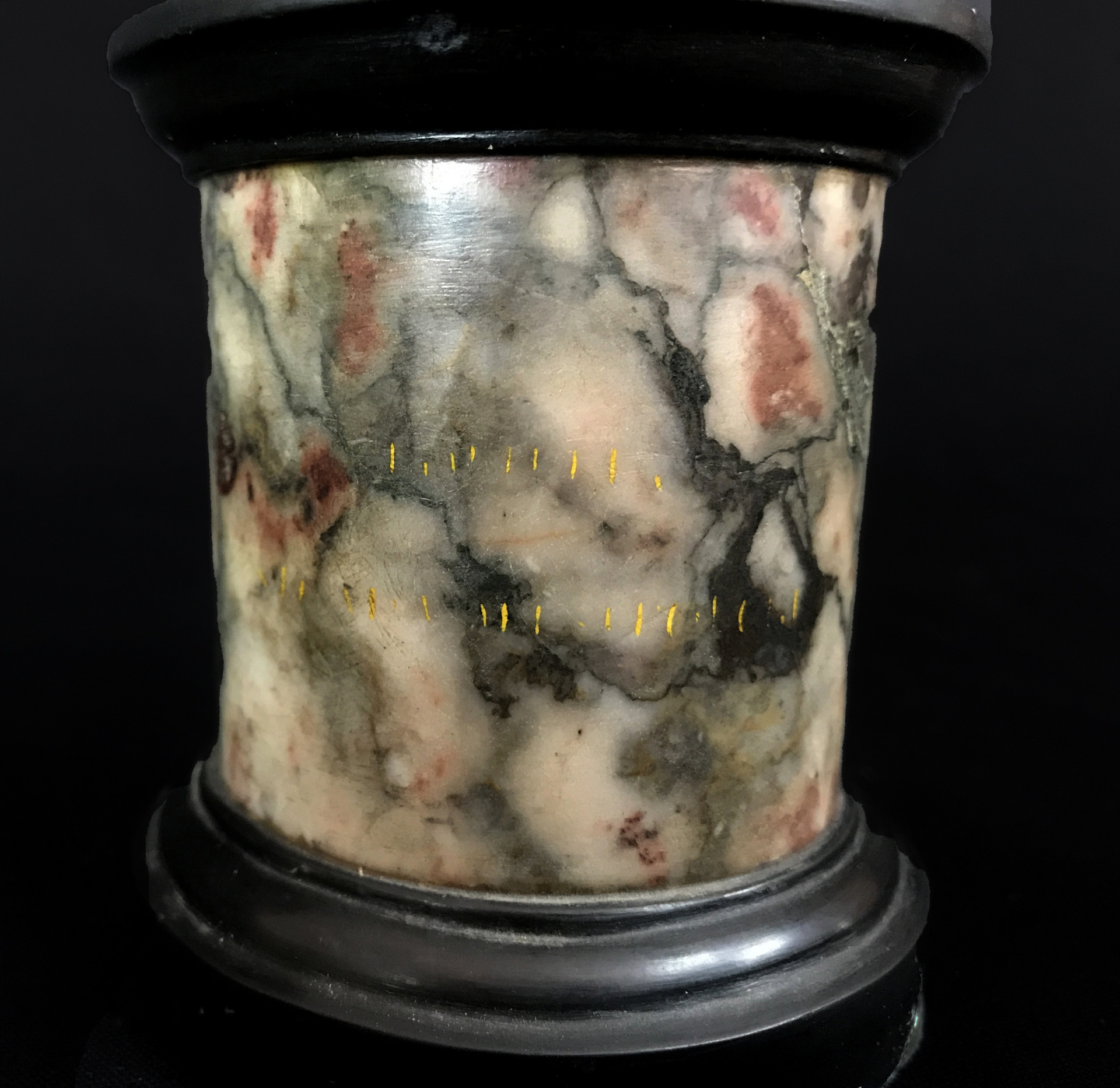The left arm, however, is raised, as if to compensate for the position by maintaining balance. Next to her, wrapped around a rocky spur, is a dolphin, an animal iconographically linked to the goddess due to her birth from the sea foam. The figure rests on a cylindrical and concave bronze base, with finely chiseled reserves. The bronze element, in turn, rests on an African marble cylinder with a base in black Belgian marble.