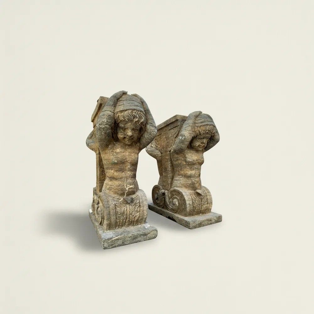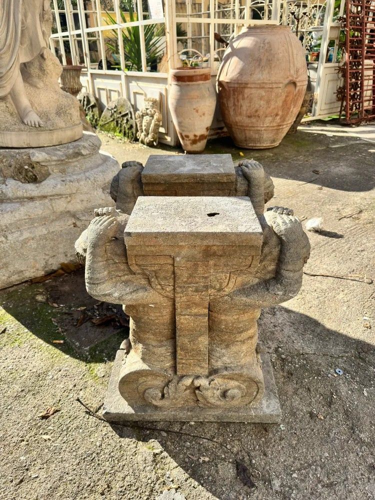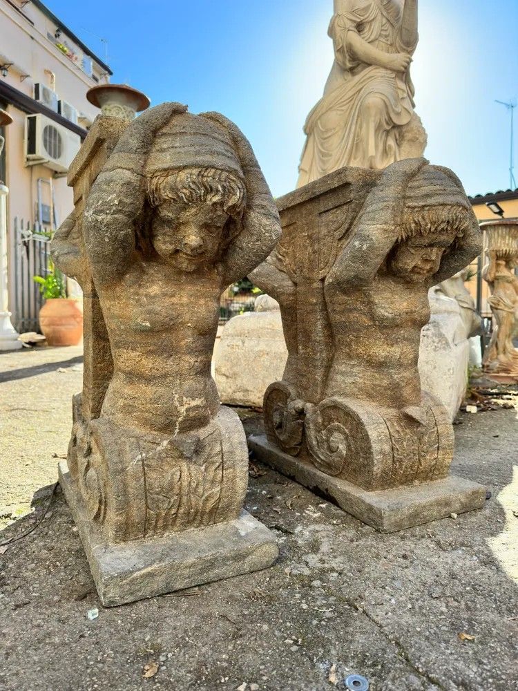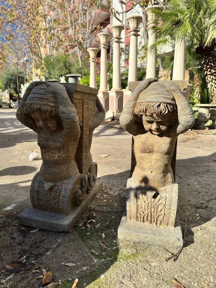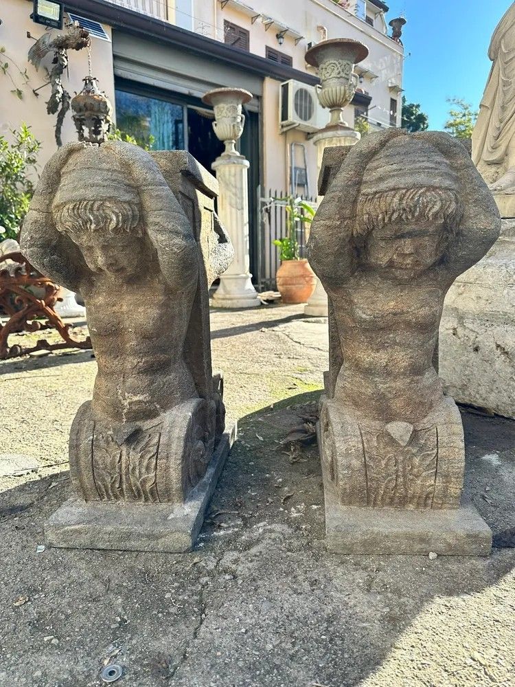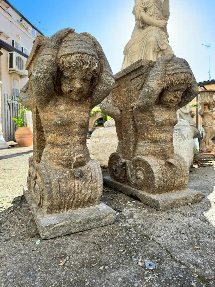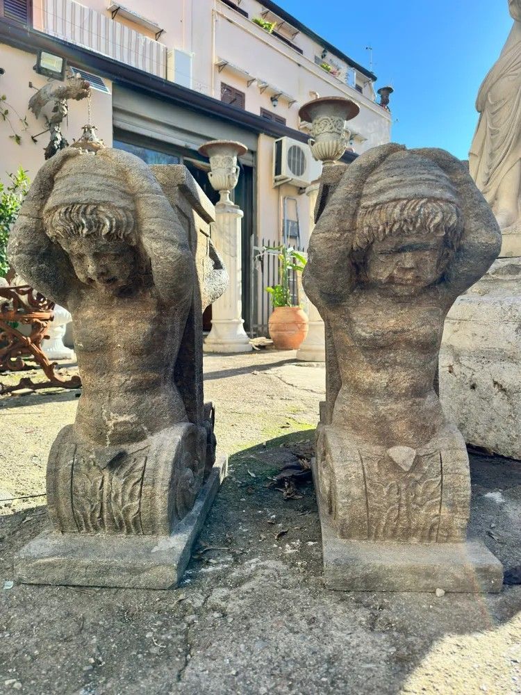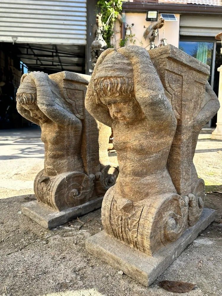 Questa raffinata coppia di basamenti in peperino proviene dalla seconda metà del XIX secolo e raffigura due poderosi Atlanti, scolpiti a tutto tondo, colti nell’atto di sorreggere un ipotetico architrave. Il peperino – pietra vulcanica tipica dell’Italia centrale – presenta una patina vissuta che conferisce un irresistibile fascino antico e testimonia la storia di questi manufatti.I busti nudi mettono in evidenza una muscolatura plastica, mentre le volute alla base rimandano ai capitelli ionici, creando un elegante dialogo tra forza e classicismo. La scultura, alta 62 cm, larga 52 cm e profonda 21,5 cm, mantiene proporzioni armoniose che la rendono perfetta sia per interni che per esterni.Materiale: peperino (tufo vulcanico) di notevole resistenza agli agenti atmosferici.Epoca: XIX secolo, lavorazione artigianale italiana.Condizioni: ottime con piccole sbeccature e segni del tempo, coerenti con l’età.Utilizzi suggeriti:• basamento per tavolo con piano in vetro o marmo (come da foto) • sostegno per lavabo, consolle o camino • elemento decorativo in giardino, loggia o ingresso scenografico.Oltre alla solida funzionalità, i due Atlanti donano un’aura di maestosità classica a qualsiasi ambiente, sposandosi con arredi contemporanei, rustici o neoclassici. Oggetti d’arte come questi non sono semplici supporti, ma veri protagonisti capaci di elevare l’estetica di uno spazio e di rappresentare un investimento duraturo nel tempo.Per chi desidera un pezzo unico, intriso di storia e di fascino senza tempo, questa coppia di basamenti in peperino è la scelta ideale.Stile: Altro stileMateriale: Marmo/PietraAltezza (cm): 62Larghezza (cm): 52Profondità (cm): 21.5Epoca: XIX Secolo - 1800
