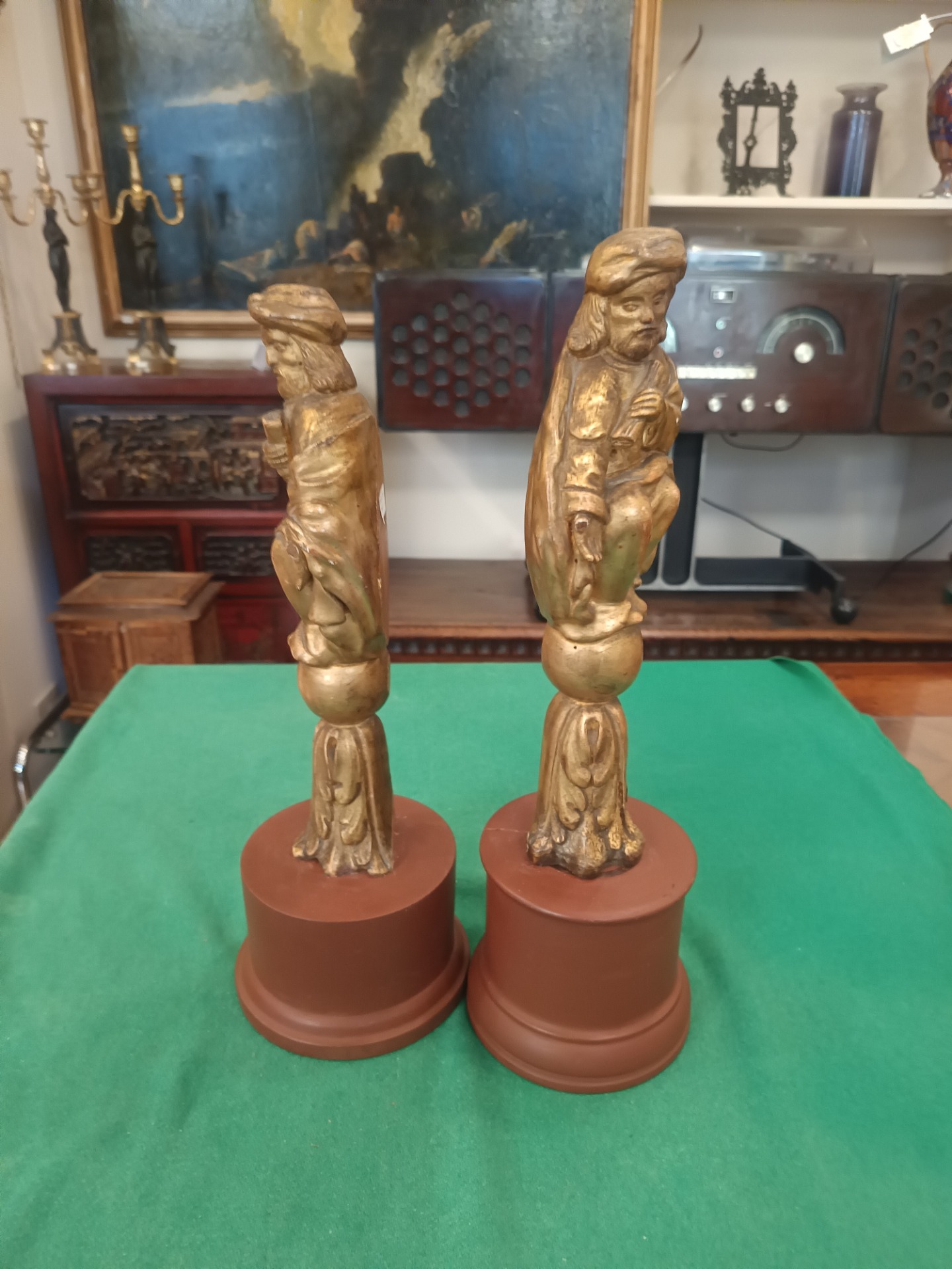 Coppia di Evangelisti in legno intagliato e dorato con base in legno. Misure: 42 cm
