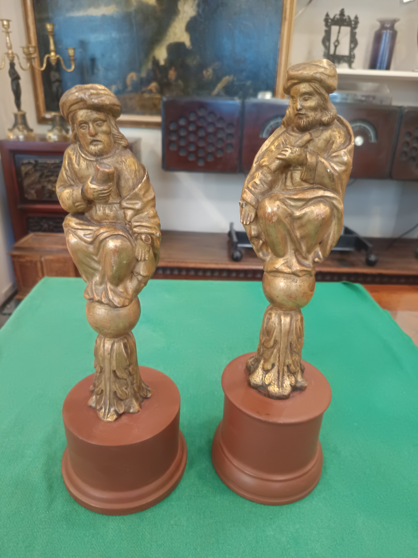 Coppia di Evangelisti in legno intagliato e dorato con base in legno. Misure: 42 cm