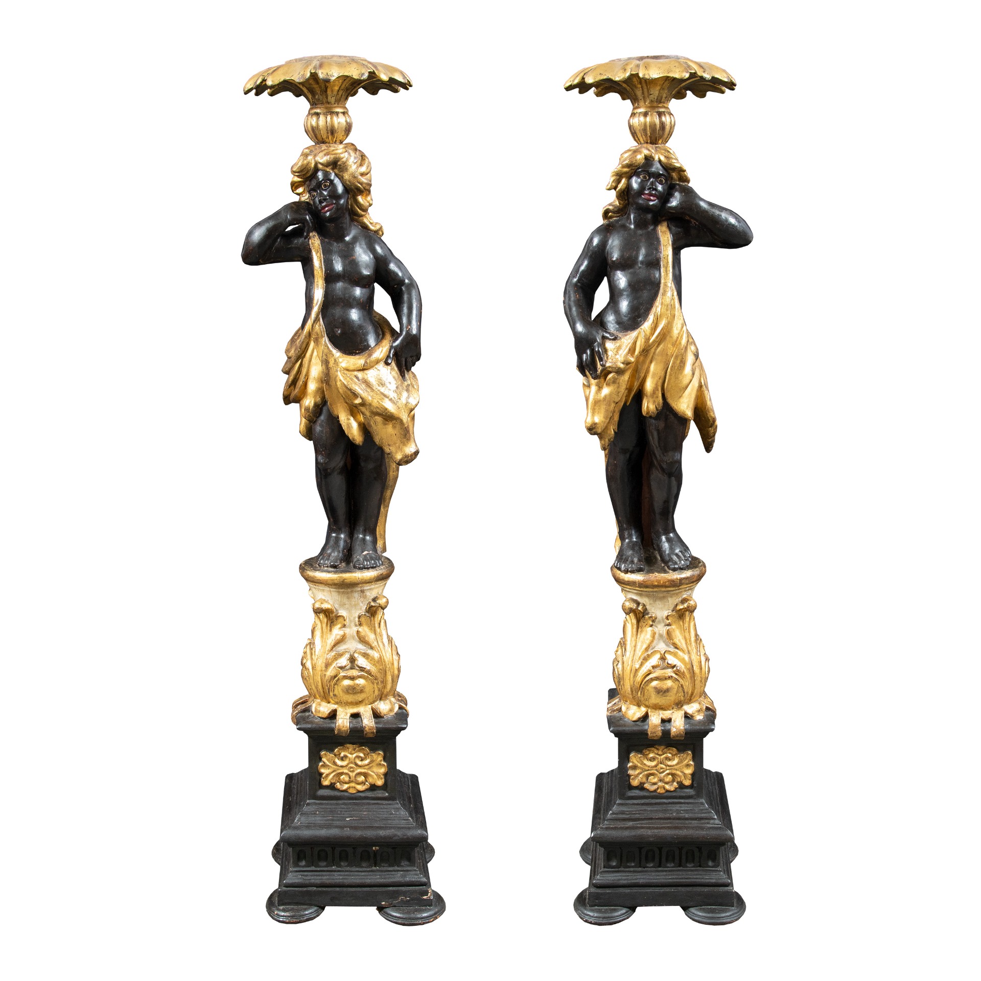 Pair of carved, gilded and painted wooden sculptures - Moorish vase holders. Venice, 18th century.