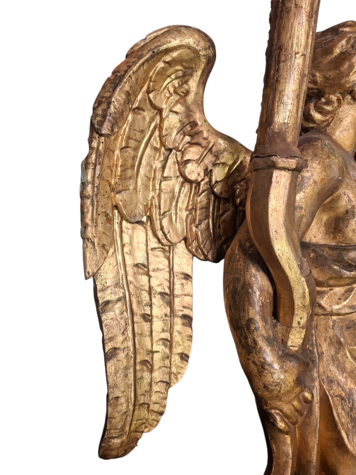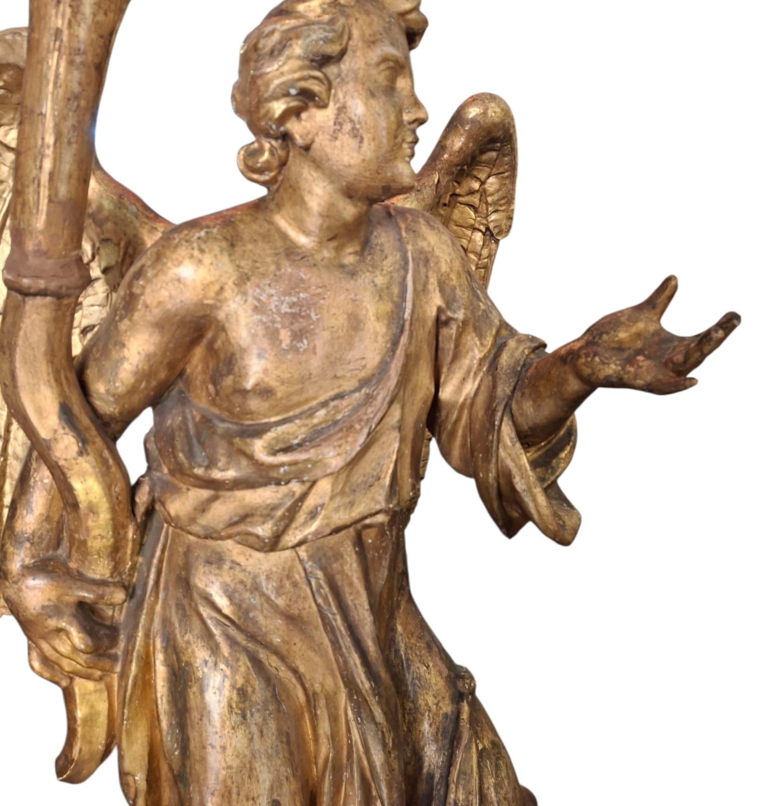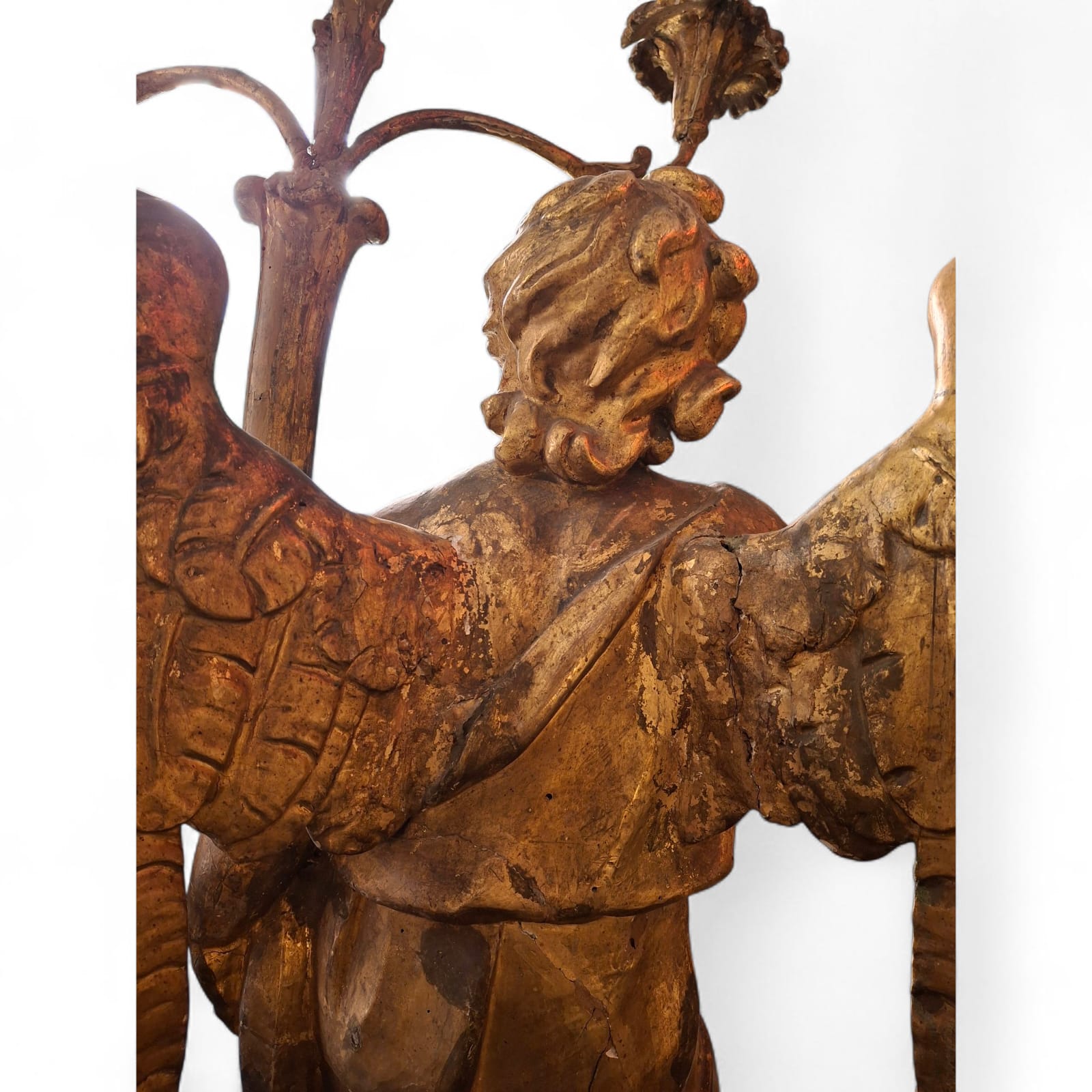 Pair of gilded wooden angels, sculptor from the first half of the 18th century, the angels hold two five-light candelabras, separately resting on two carved and gilded bases on three sides, overall height 181 cm, the base measures 47x43 cm maximum, the base of the angels measures 30x29 cm.