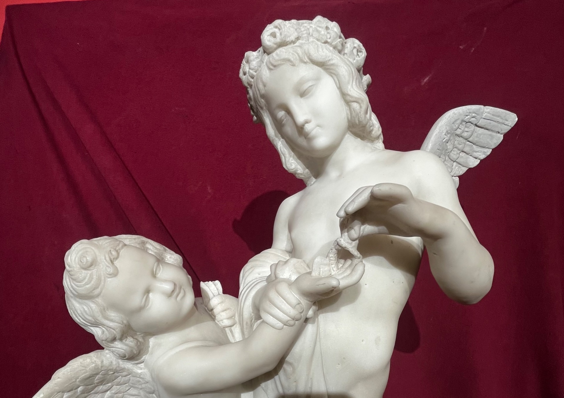 Spectacular sculpture "Psyche and Cupid". Carrara statuary marble. H. 80 cm. Accompanied by a certificate of authenticity according to law n 1062 art 2