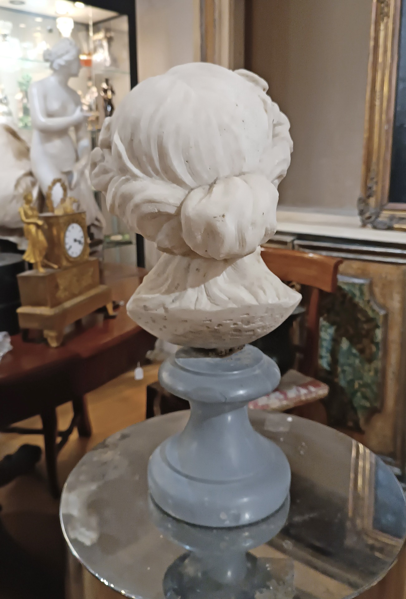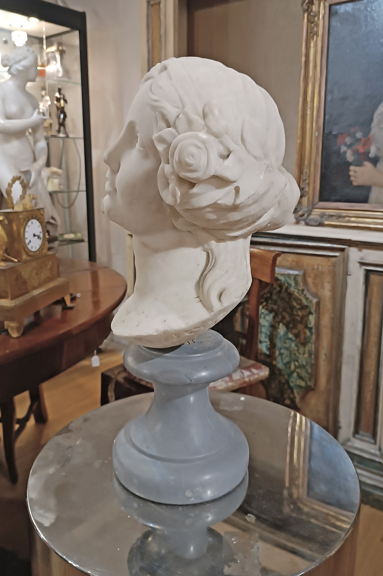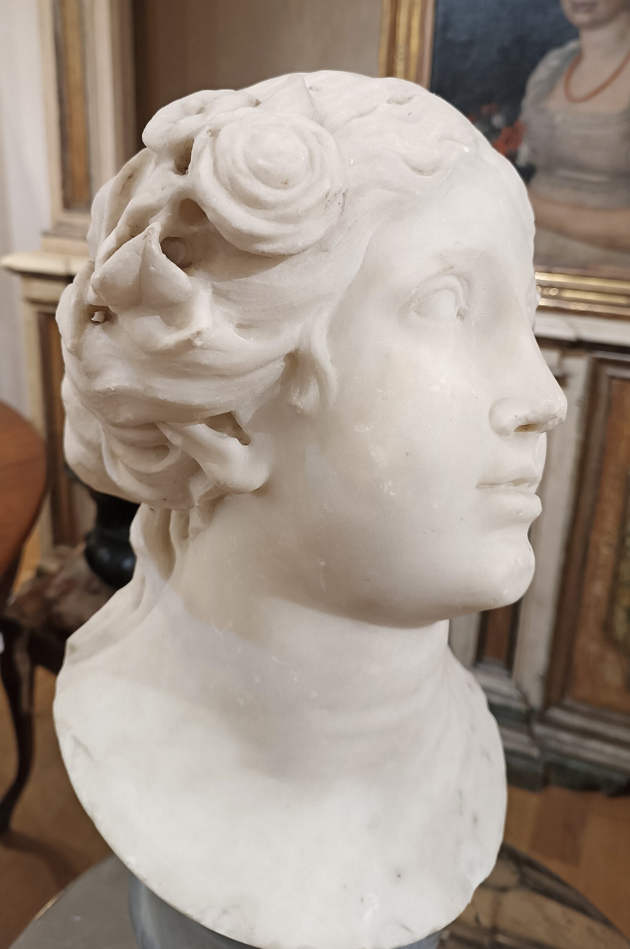 Refined sculpture in Carrara statuary marble on a turned grey bardiglio marble base. The sculpture represents the allegory of spring, depicted as a woman with her face slightly tilted back and curly hair gathered in a bun. The quality of the stylistic rendering and details of the face, which give the work great taste and class, capable of furnishing any environment with elegance and a touch of antiquity, can be appreciated. Tuscan manufacture (Tuscany, Italy) from the neoclassical period, around the second half of the 18th century.