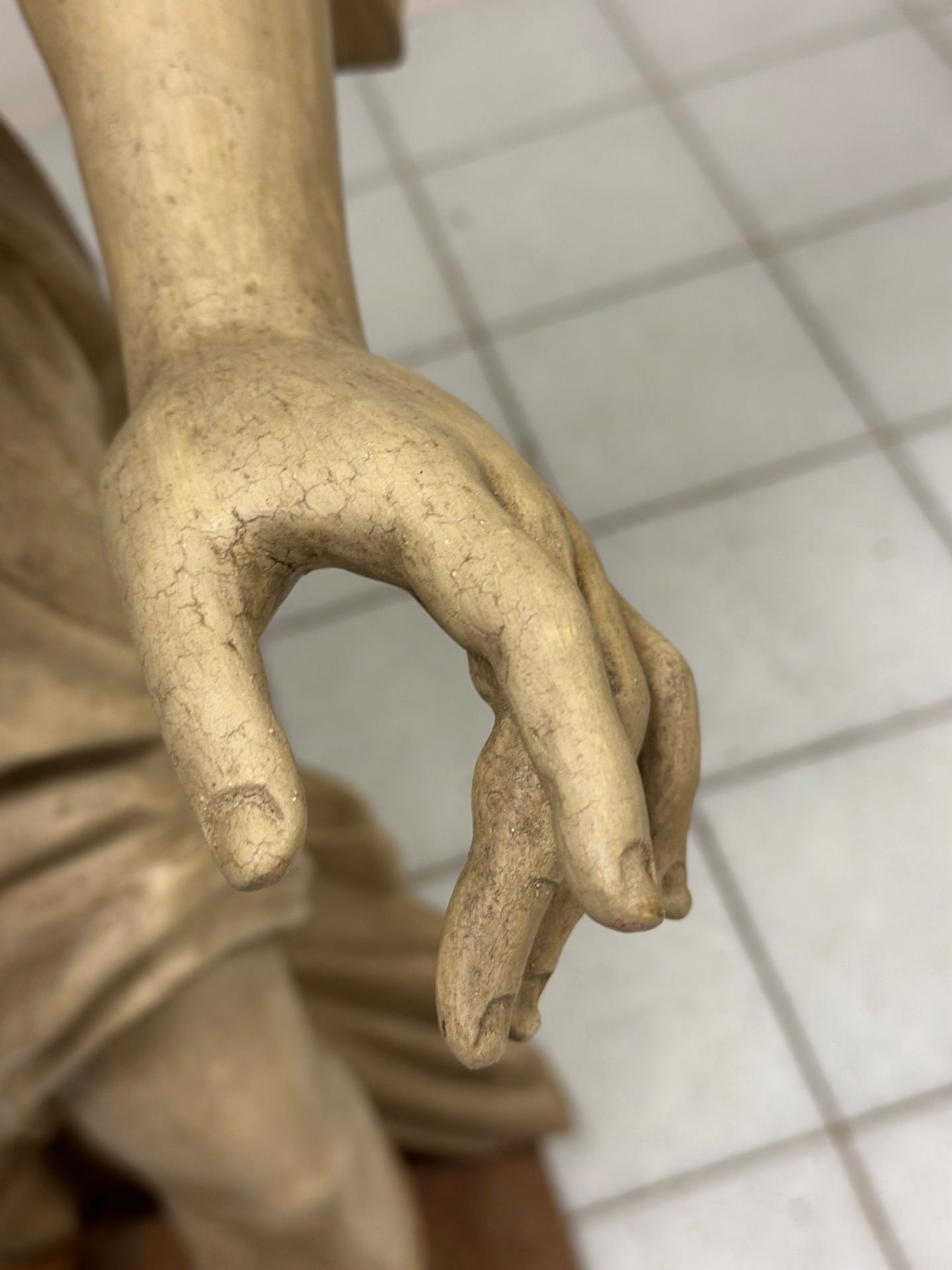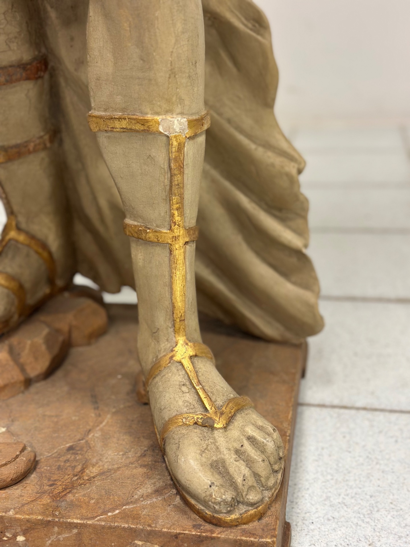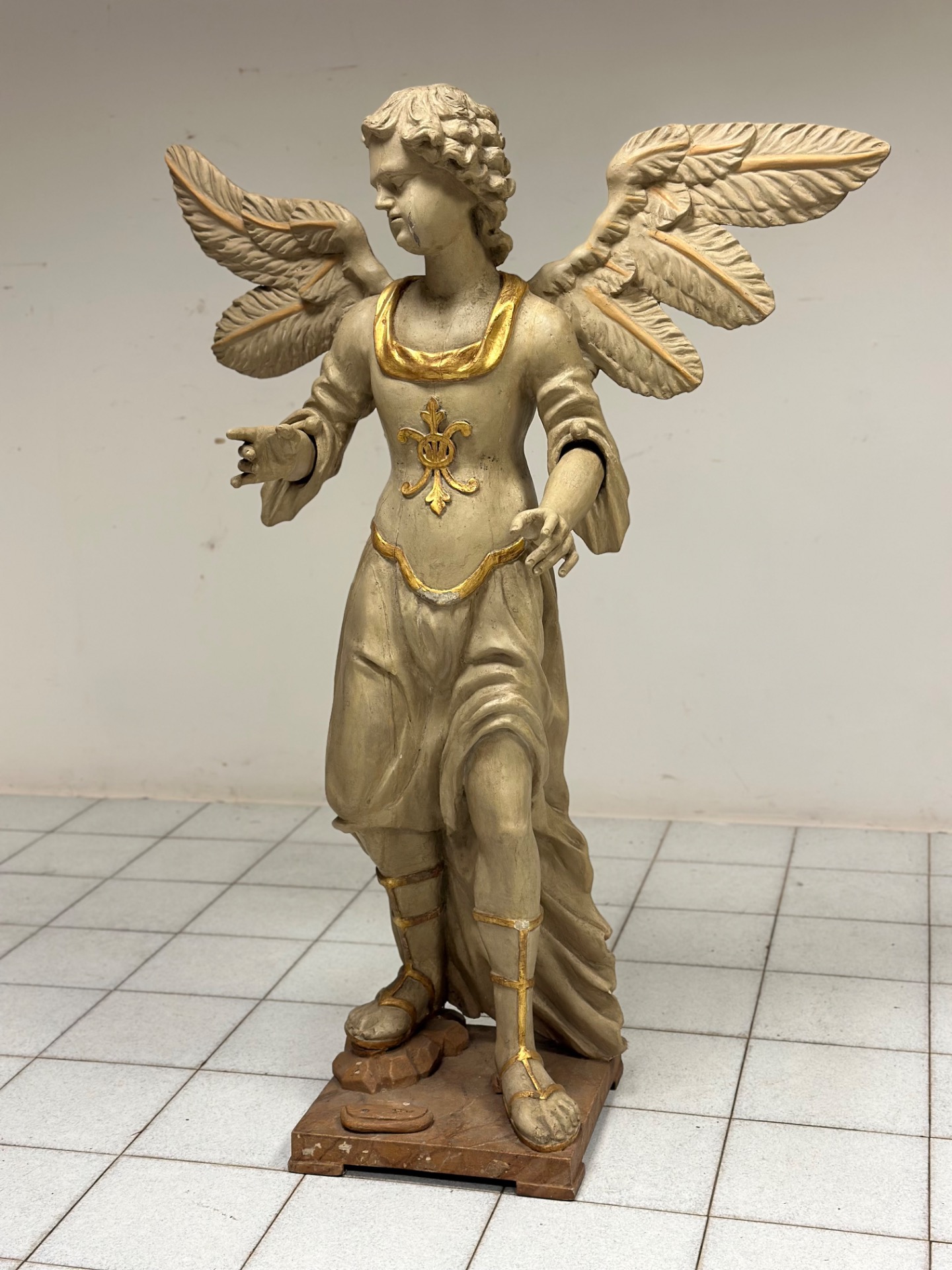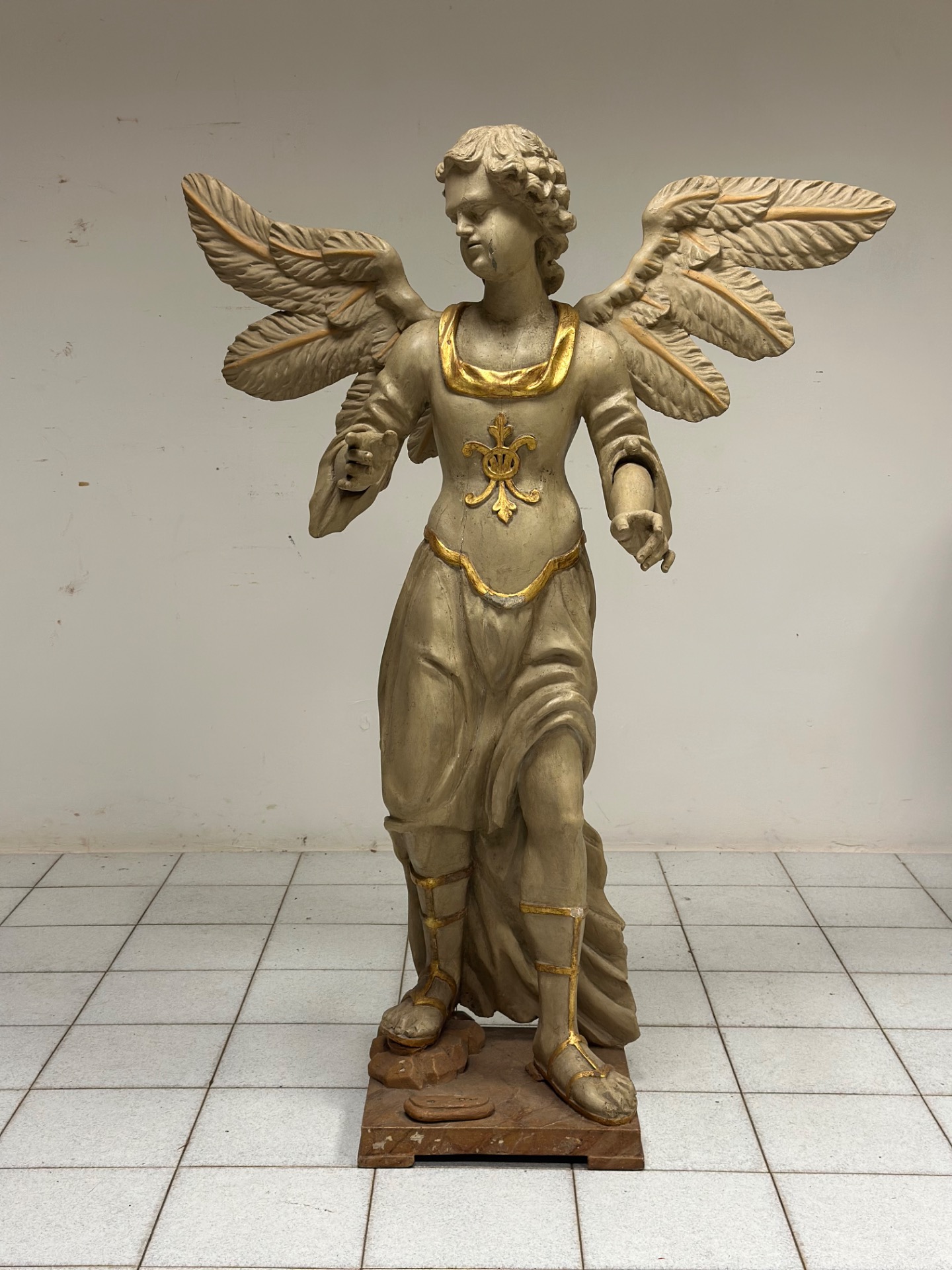 Free-standing sculpture in carved and gilded wood, dating from the first half of the 18th century, depicting a winged angel from the Sienese area of Tuscany. It features billowy drapery and a robe that falls over the body with a sandal. Excellent workmanship, with a decoration on the front that resembles a lily.