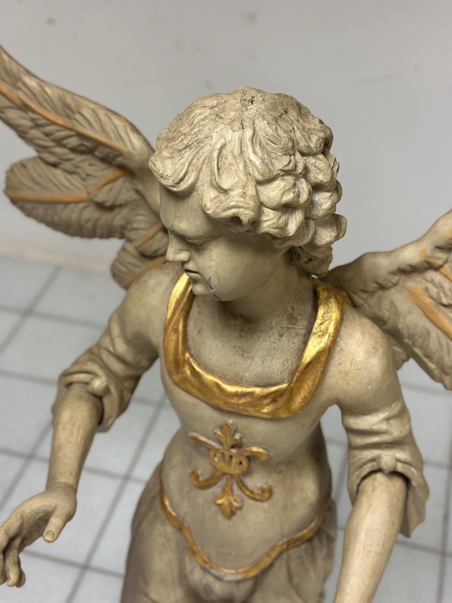 Winged angel in carved and gilded wood. Siena, 18th century. H 136 cm