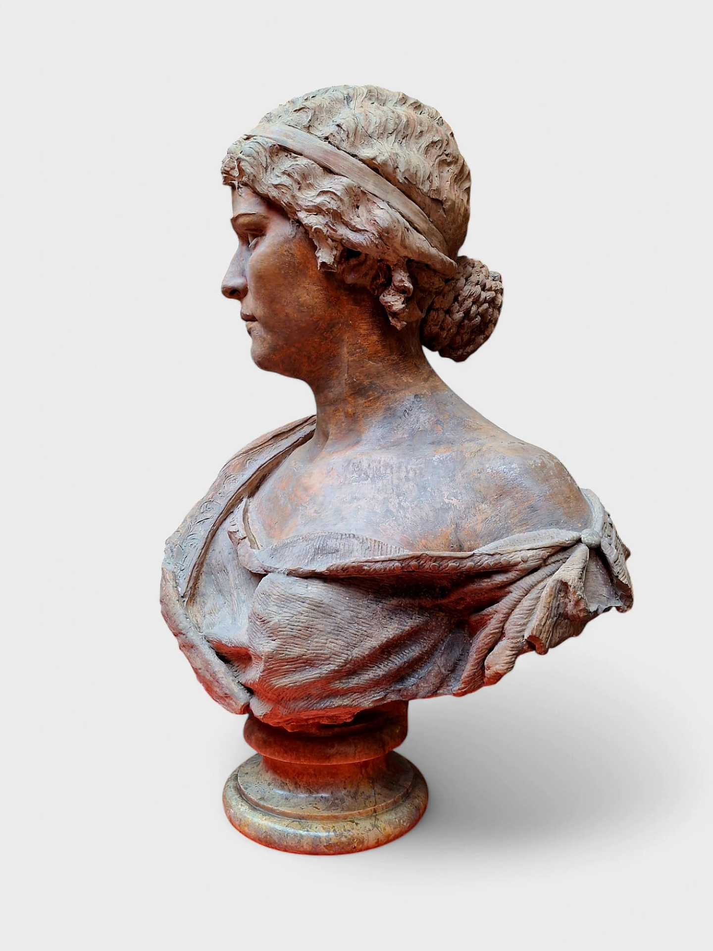 Adolfo Laurenti (Monte Porzio Catone, 1858 – Rome, 1944), Bust of Anita Garibaldi, terracotta sculpture, round marble base, signed and dated '78, overall height 90 cm, dimensions approximately 60x43 cm.