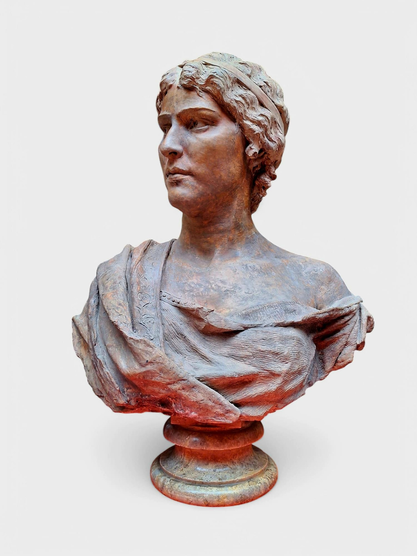 Adolfo Laurenti (Monte Porzio Catone, 1858 – Rome, 1944), Bust of Anita Garibaldi, terracotta sculpture, round marble base, signed and dated '78, overall height 90 cm, dimensions approximately 60x43 cm.