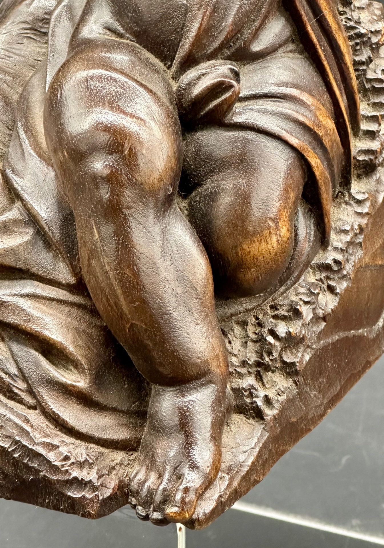 Carved Wooden Sculpture - Putto with Dog - Period: 19th Century Refined carved wooden sculpture depicting a putto lying in an affectionate attitude with a stick lying beside him. The work is characterized by remarkable attention to detail, both in the child's anatomy and in the expressive and...