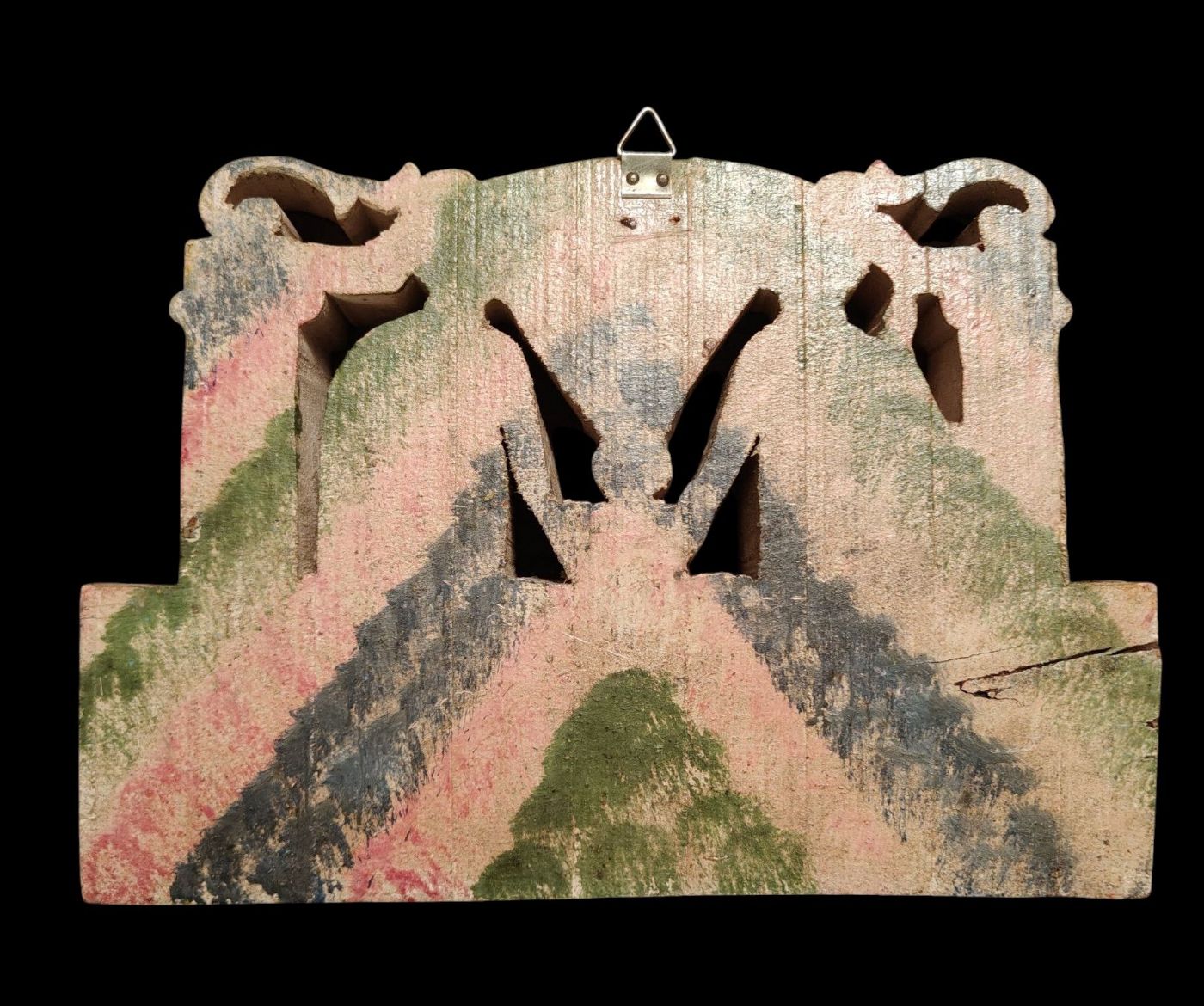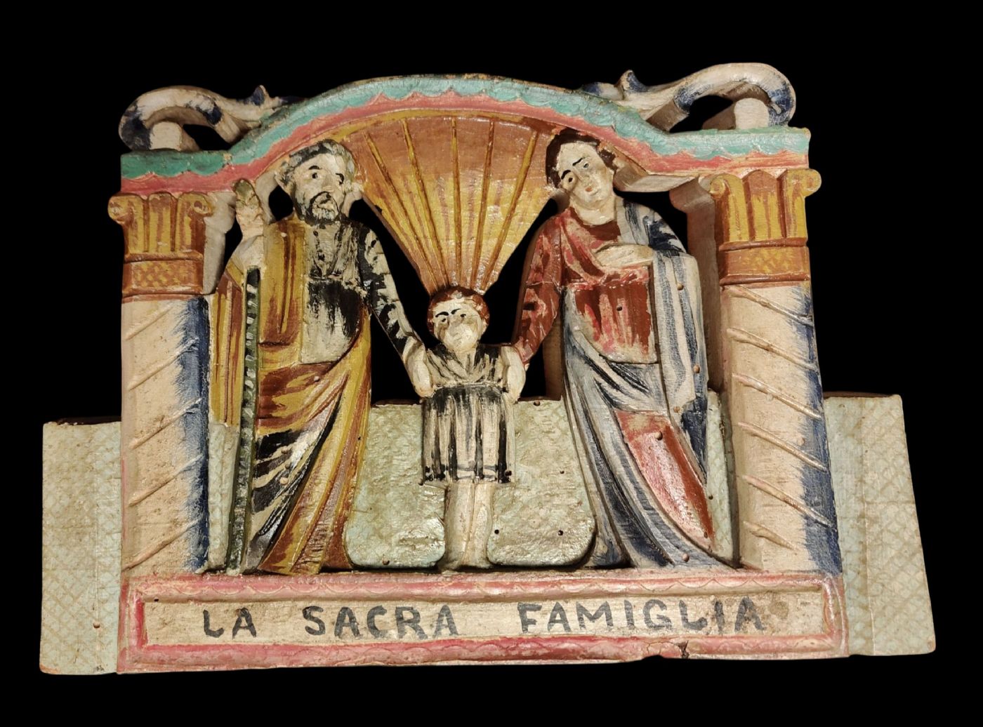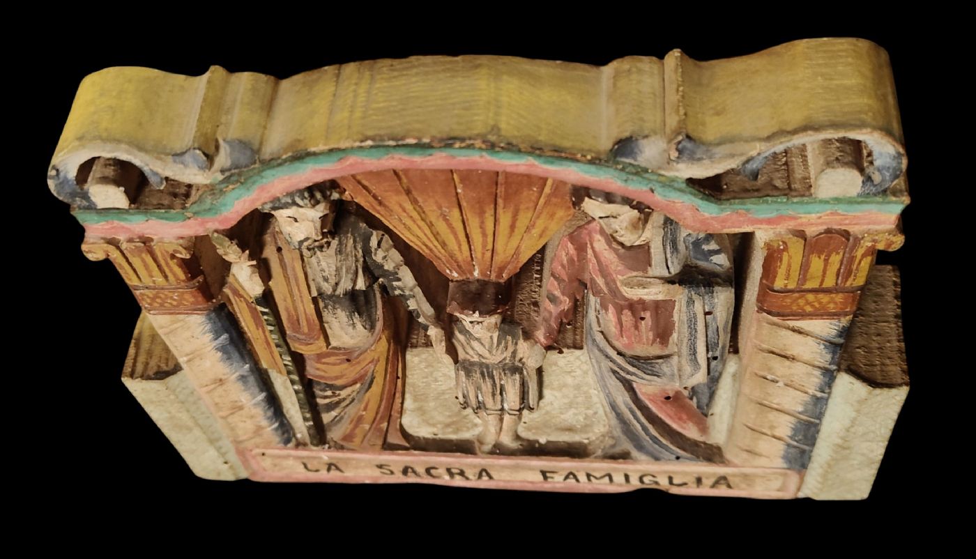 Element of a cart in carved and painted wood depicting the Holy Family.