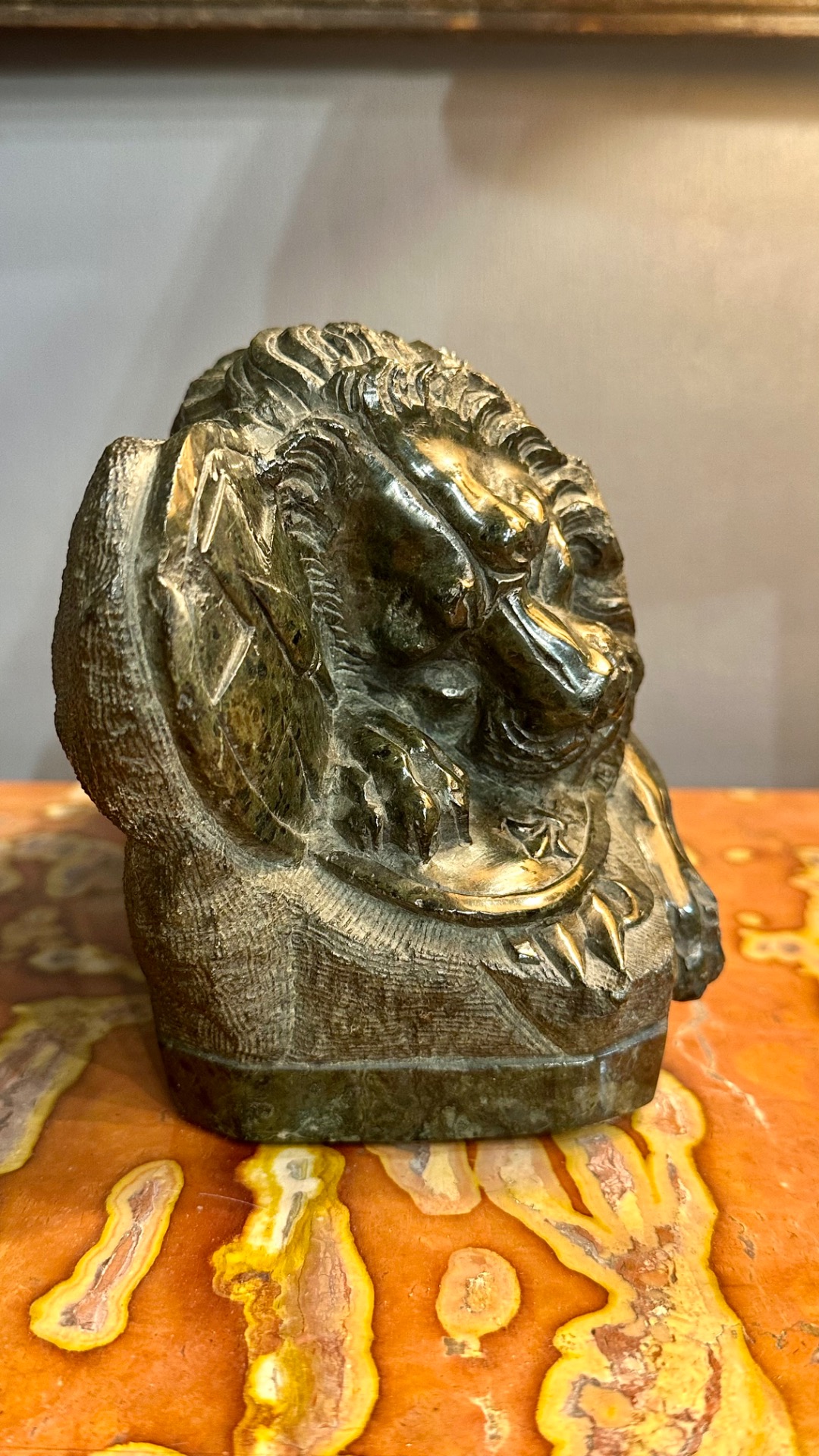 GRAND TOUR MARLE SCULPTURE OF THE LION OF LUCERNE - 19th century. From Bertel Thorvaldsen: a finely sculpted serpentine marble Lion of Lucerne. In 1818-1819, the famous Danish sculptor Bertel Thorvaldsen (1770-1844) made a model for a monument to the Swiss Guards who had fought in Paris in defense of King Louis XVI during the storming of the Tuileries by revolutionary forces on August 10, 1792. The monument, the Dying Lion (the Lion of Lucerne), was eventually carved in colossal dimensions, following Thorvaldsen's model, directly into the rock face of the Glacier Garden in Lucerne, where it was inaugurated in 1821. Dating back to the last quarter of the 19th century, our serpentine model is a typical souvenir of a Grand Tour in Italy and Switzerland. Thorvaldsen worked extensively in Italy, where he was considered by Grand Tour travelers to be the most important sculptor of the Neoclassical and early Romantic period, along with the Italian sculptor Antonio Canova. Origin: Italy Period: last quarter of the 19th century Measurements: cm. 23.5 x 11.5 - height cm. 13 Item accompanied by a certificate of authenticity. This item, like all our objects, is sold accompanied by a photographic certificate of authenticity and lawful origin. This document identifies the item, adding more value to the item. We handle transport and personally organize the packing and shipping of works of art worldwide.             ?? Antichità DELMONTE ?? https://www.instagram.com/delmonteantichita/ CONTACTS: FOR ANY ADDITIONAL INFORMATION, PLEASE DO NOT HESITATE TO CONTACT ME! Cell. Anna 338 4989679 EMAIL: annadelmonteantico@libero.it