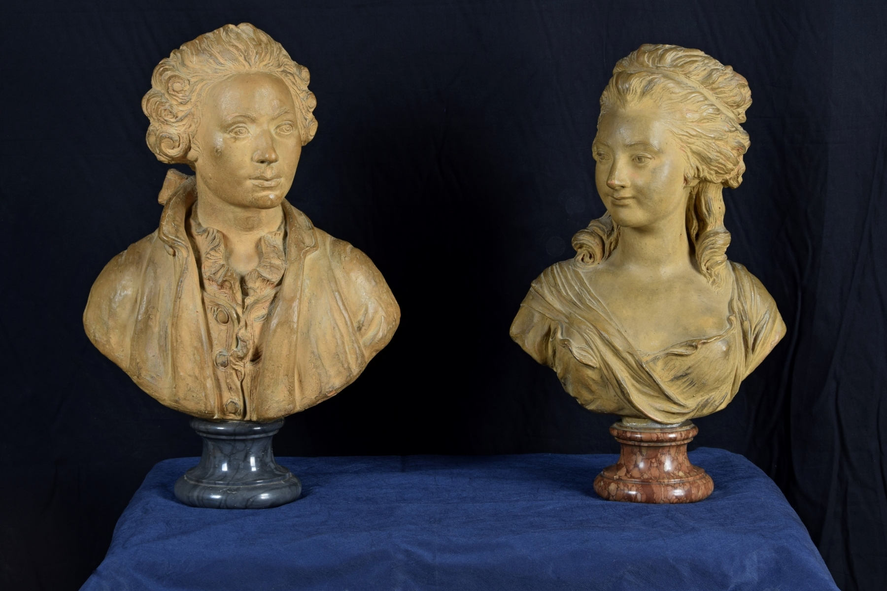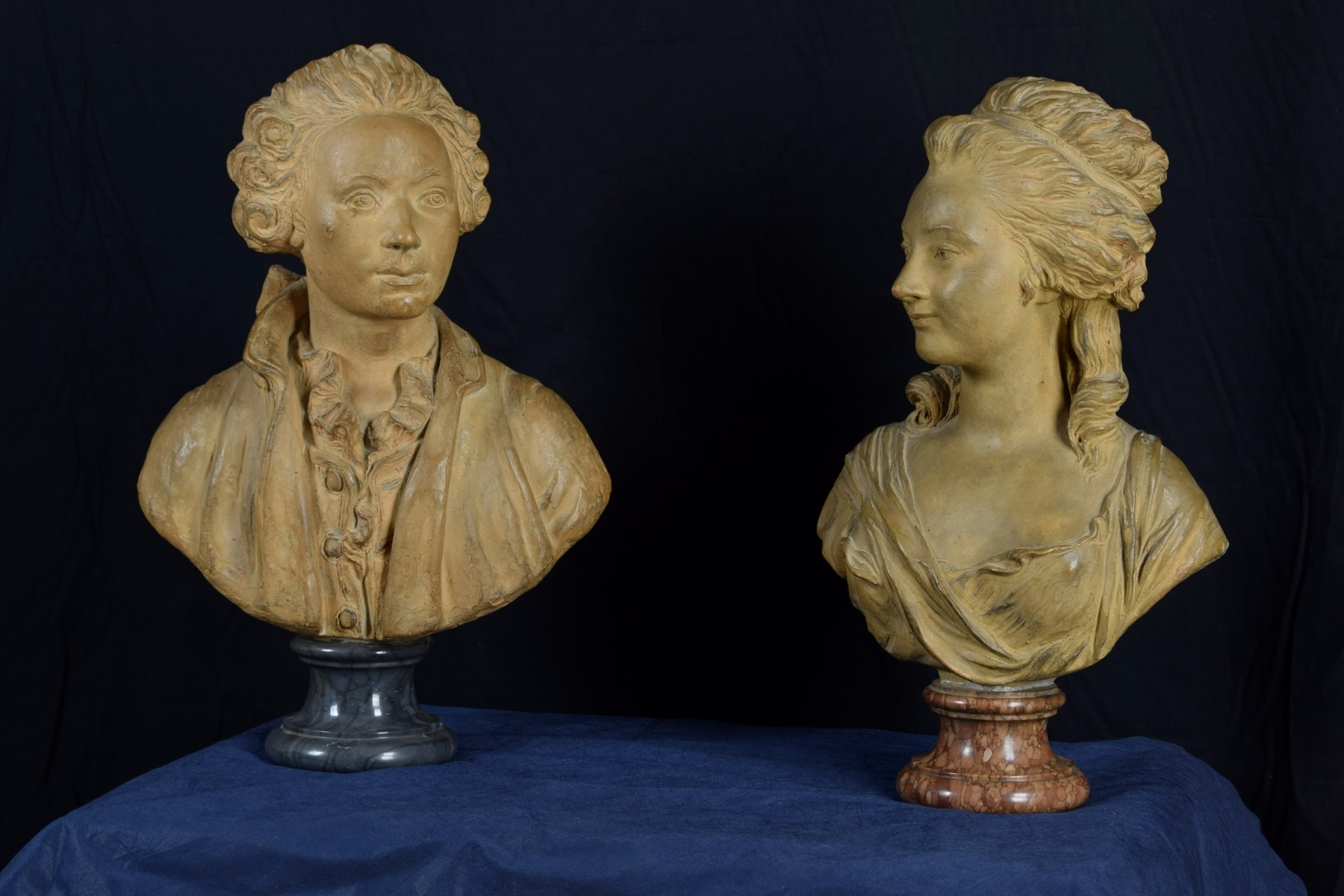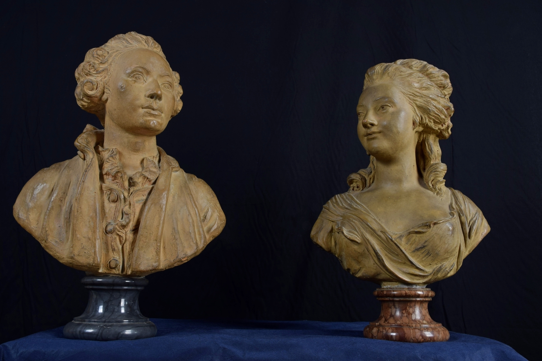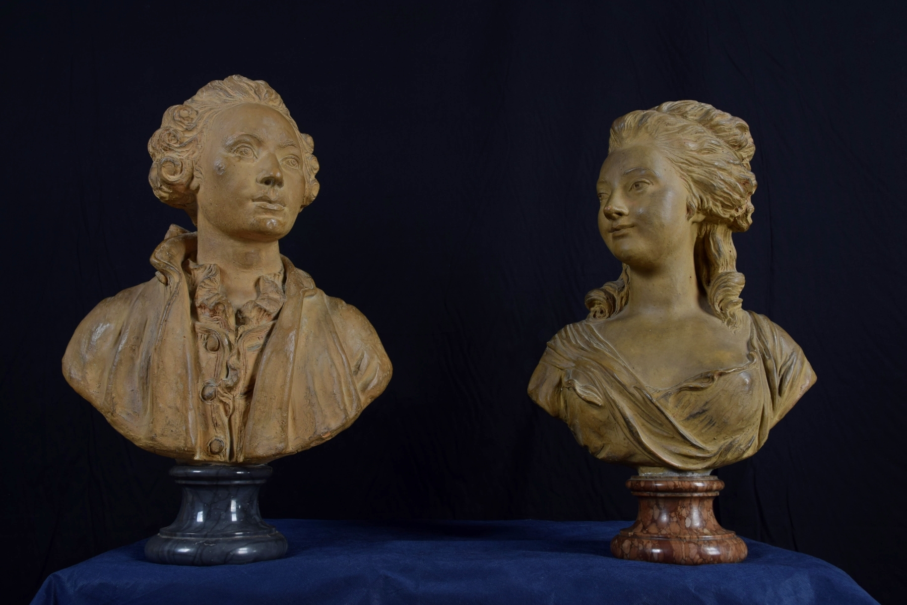 The refined pair of busts depicts a man and a woman dressed according to the fashion of mid-18th century France. The graceful young woman has her hair styled according to the taste that spread at the court of King Louis XV. She wears a simple dress that rests on her neckline. The man wears his hair tied in a ponytail with a ribbon. He wears an open jacket that showcases a rich Rococo-style shirt.