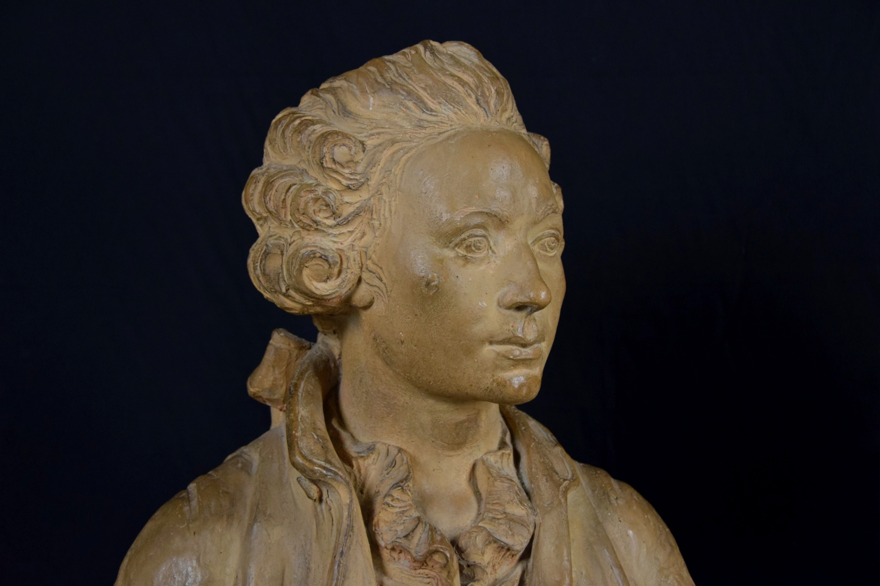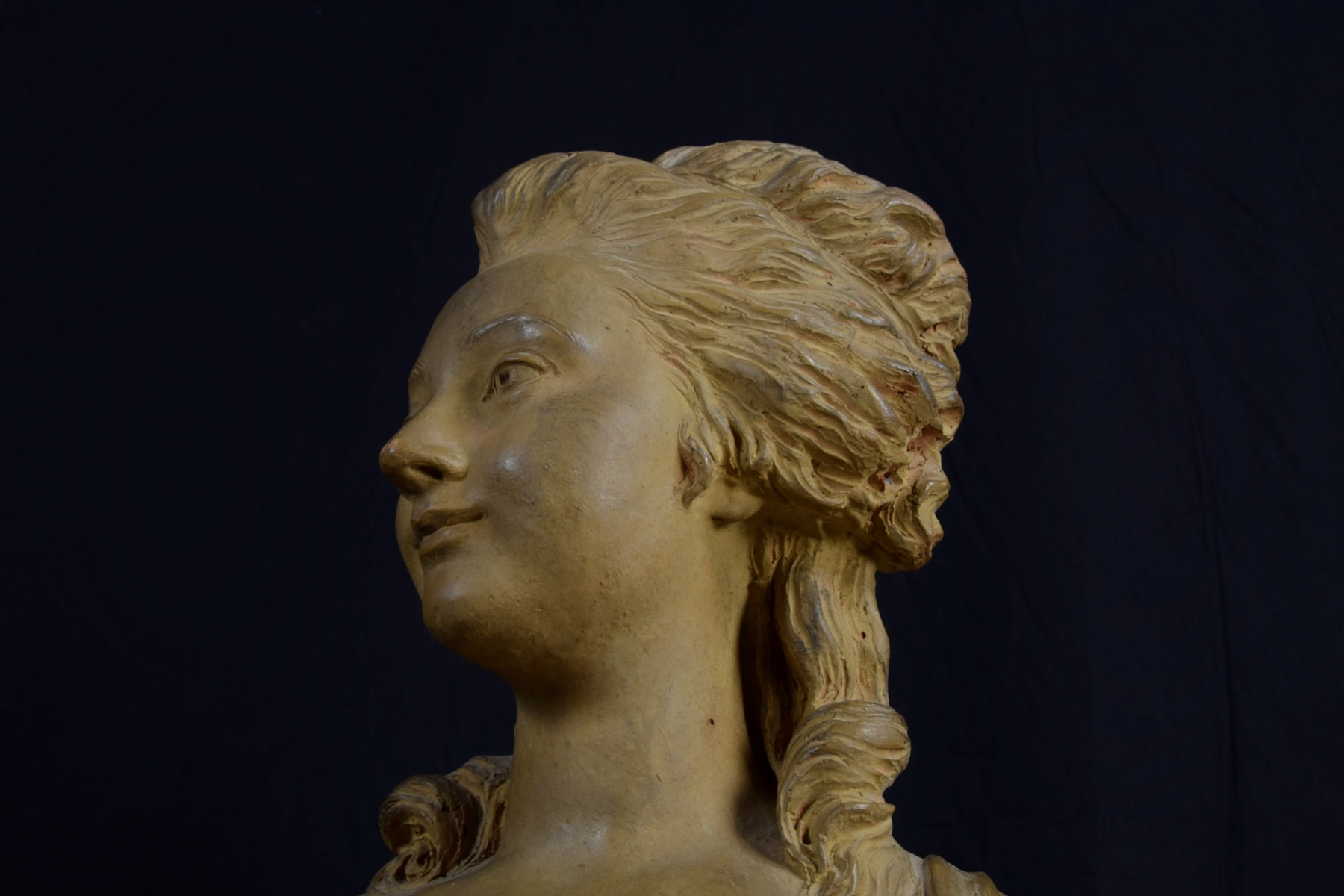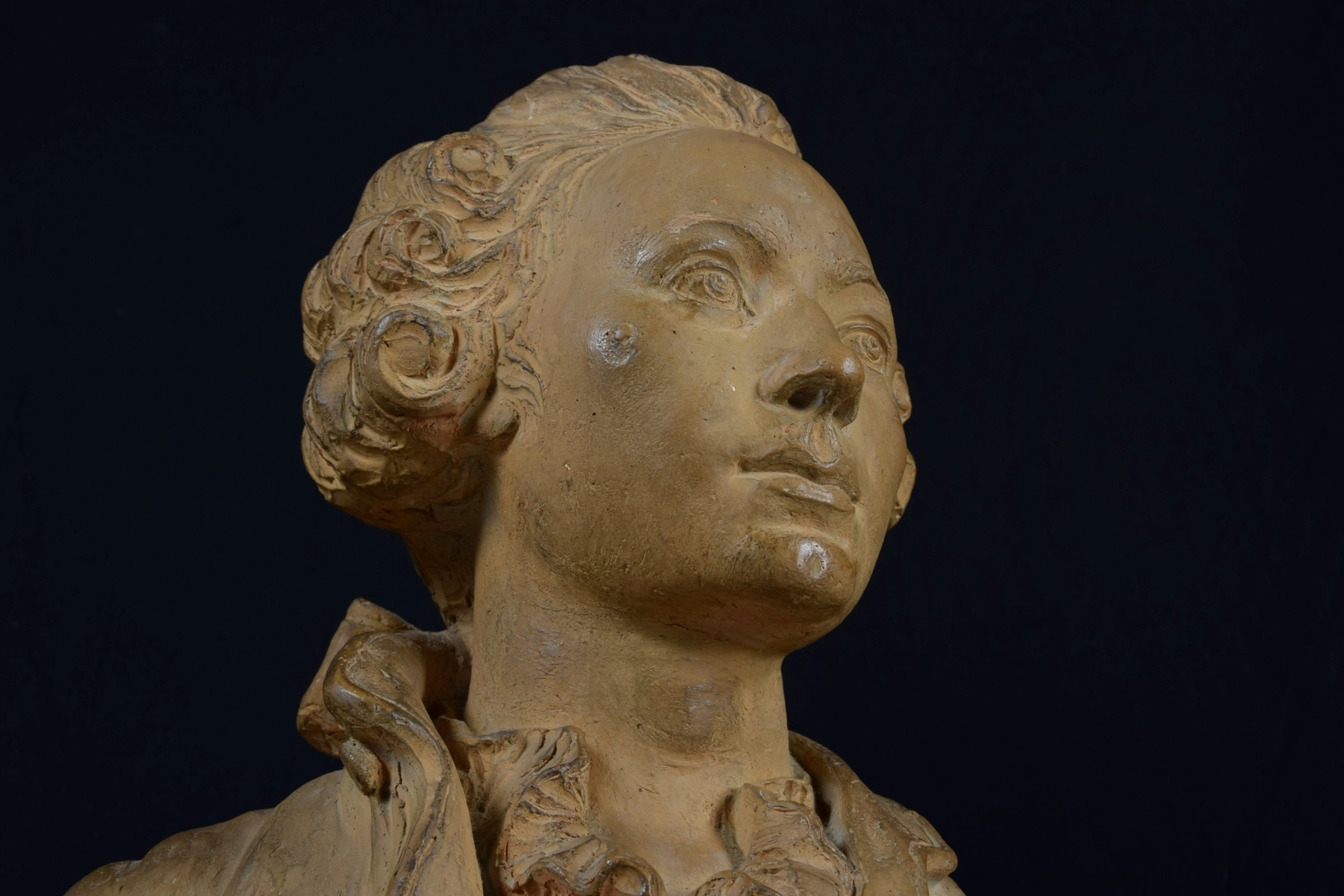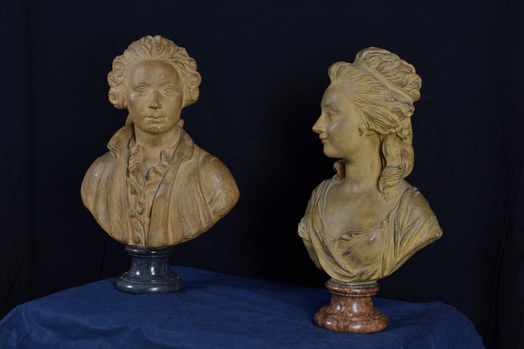 The refined pair of busts depicts a man and a woman dressed according to the fashion of mid-18th century France. The graceful young woman has her hair styled according to the taste that spread at the court of King Louis XV. She wears a simple dress that rests on her neckline. The man wears his hair tied in a ponytail with a ribbon. He wears an open jacket that showcases a rich Rococo-style shirt.