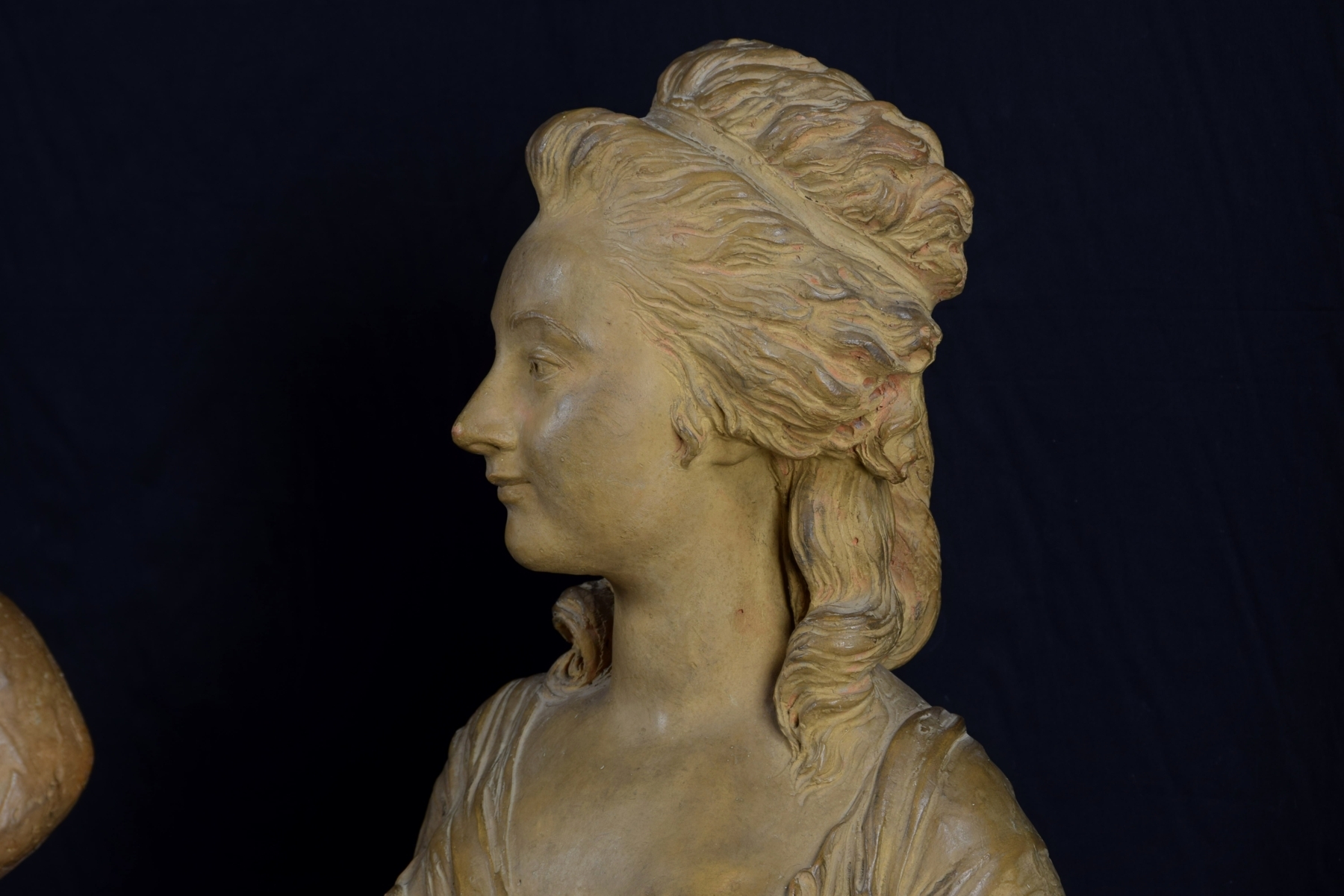 Pair of 19th-century French terracotta busts resting on circular marble bases, signed on the back.