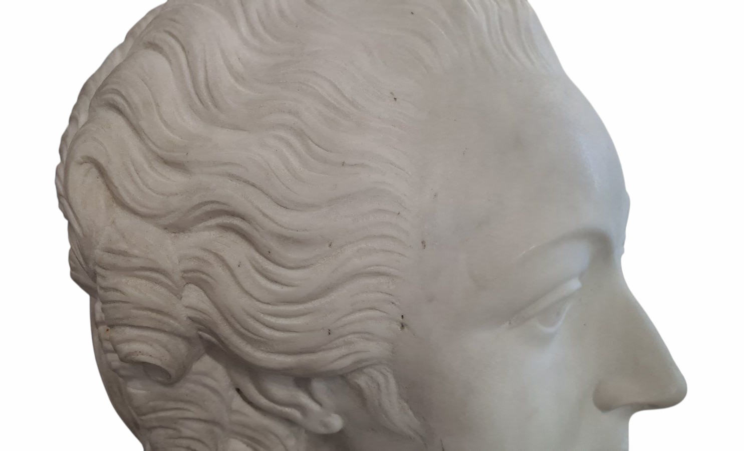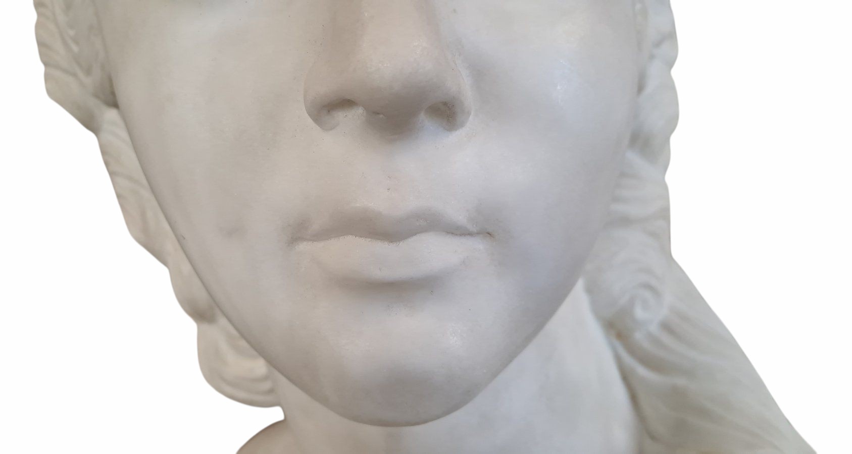 The details are finely sculpted: from the wavy and flowing hair, typical of the hairstyles of the time, to the draping of the dress that falls softly on the right shoulder.