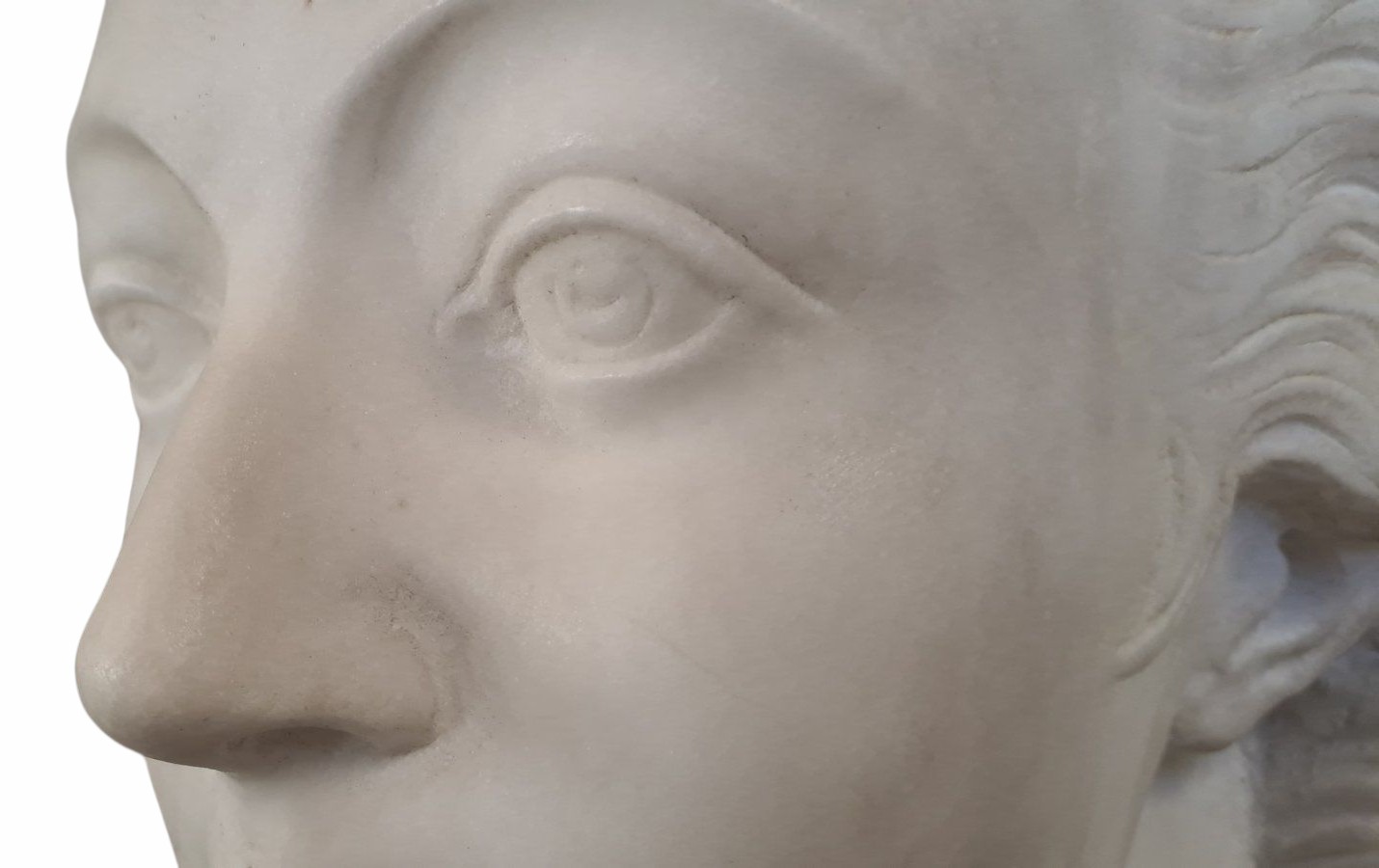 The bust rests on a circular column base, also in marble, which enhances its monumentality and makes it a perfect piece of furniture for any classic or modern environment that desires a touch of history and art.