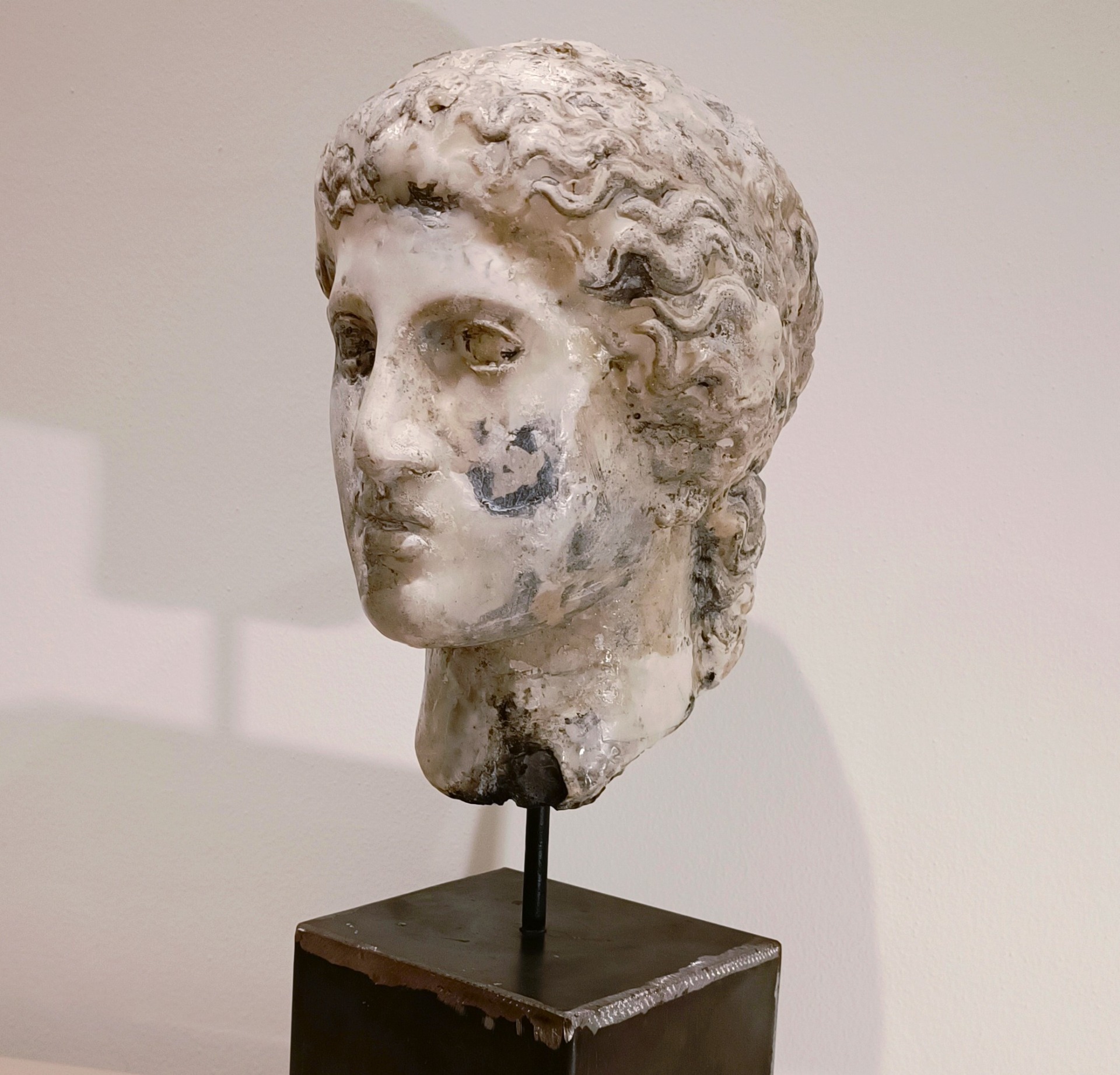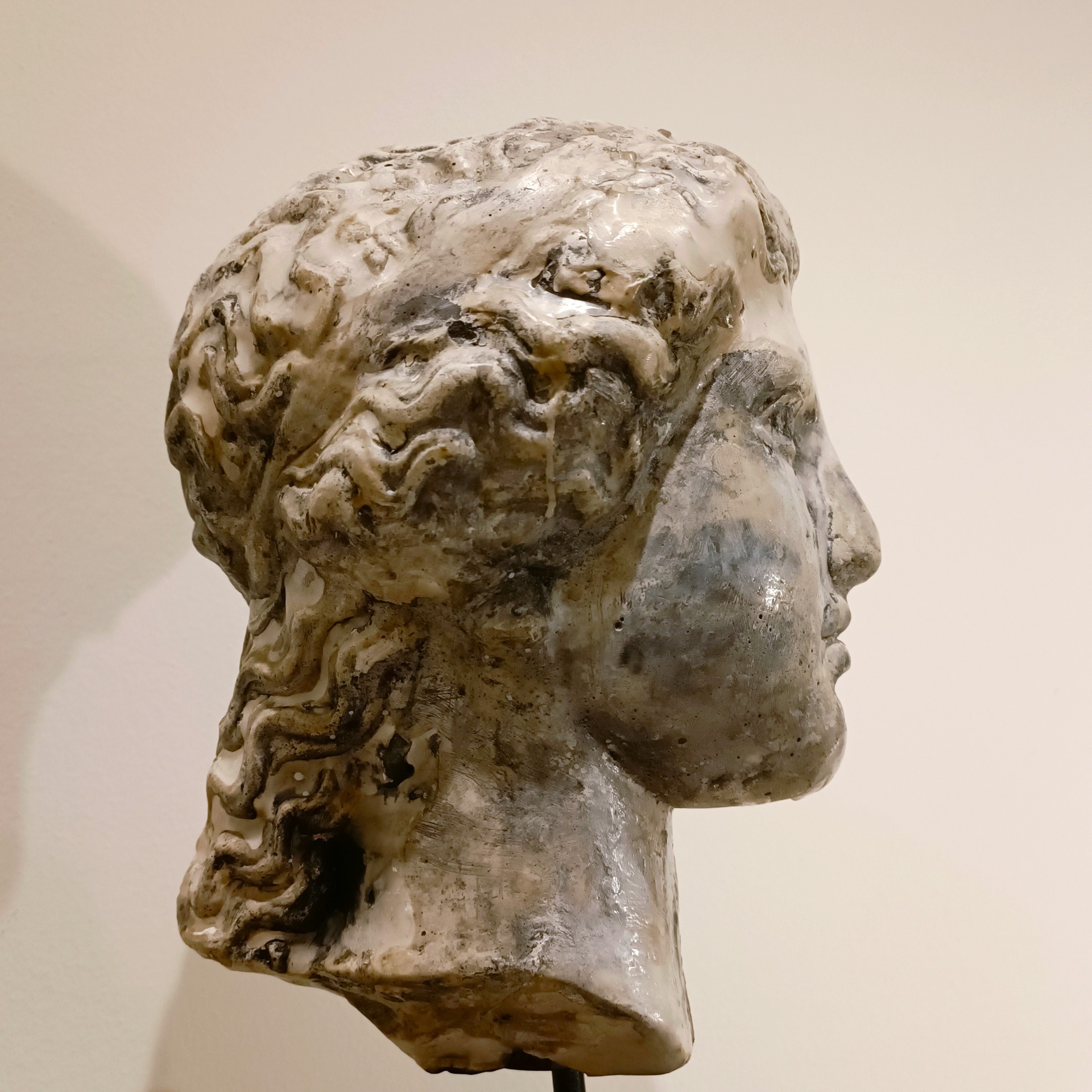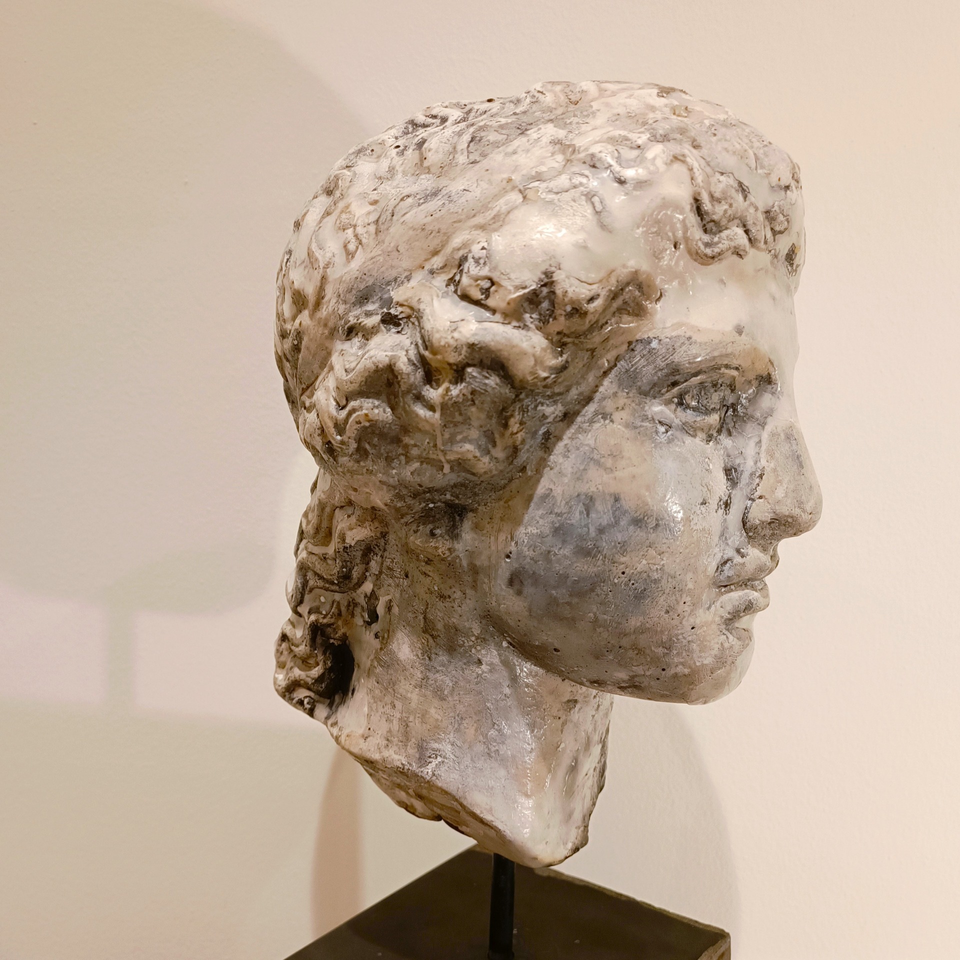 A work of rare beauty and academic charm: a wax sculpture from the early 20th century depicting the head of Hera, the majestic queen of Olympus in Greek mythology. Originating from the warehouses of a French academic school, this creation is a refined example of formative art and classical study. The work, in excellent general condition, measures 27x25x20 cm and rests on a 50 cm base, which enhances its grandeur and aesthetic balance.