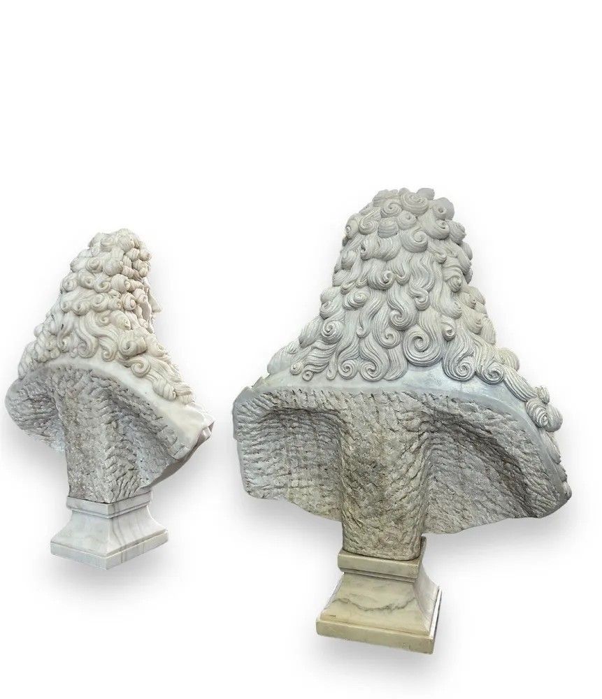 Questa coppia di busti in marmo è un'opera d'arte straordinaria, rappresentando nobili francesi del XIX secolo. Uno dei busti raffigura Luigi XIV, il Re Sole. Sono di eccelsa manifattura italiana, poggiano su due colonne realizzate in diaspro siciliano, onice e marmo bianco di Carrara.