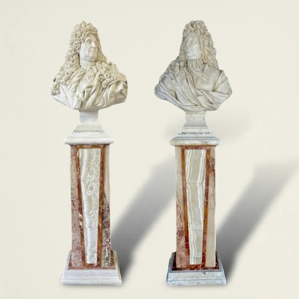 Questa coppia di busti in marmo è un'opera d'arte straordinaria, rappresentando nobili francesi del XIX secolo. Uno dei busti raffigura Luigi XIV, il Re Sole. Sono di eccelsa manifattura italiana, poggiano su due colonne realizzate in diaspro siciliano, onice e marmo bianco di Carrara.Manifattura italiana di alta qualità.Le colonne risalgono al XIX secolo.Misure busti: H 100 x L 76 x P 35 cmMisure colonne: H 137 x L 55 x P 39 cmLe colonne ed i busti possono essere venduti separatamente.Stile: NeoclassicoMateriale: Marmo/PietraAltezza (cm): 230Larghezza (cm): 76Profondità (cm): 39Epoca: XX Secolo - 1900
