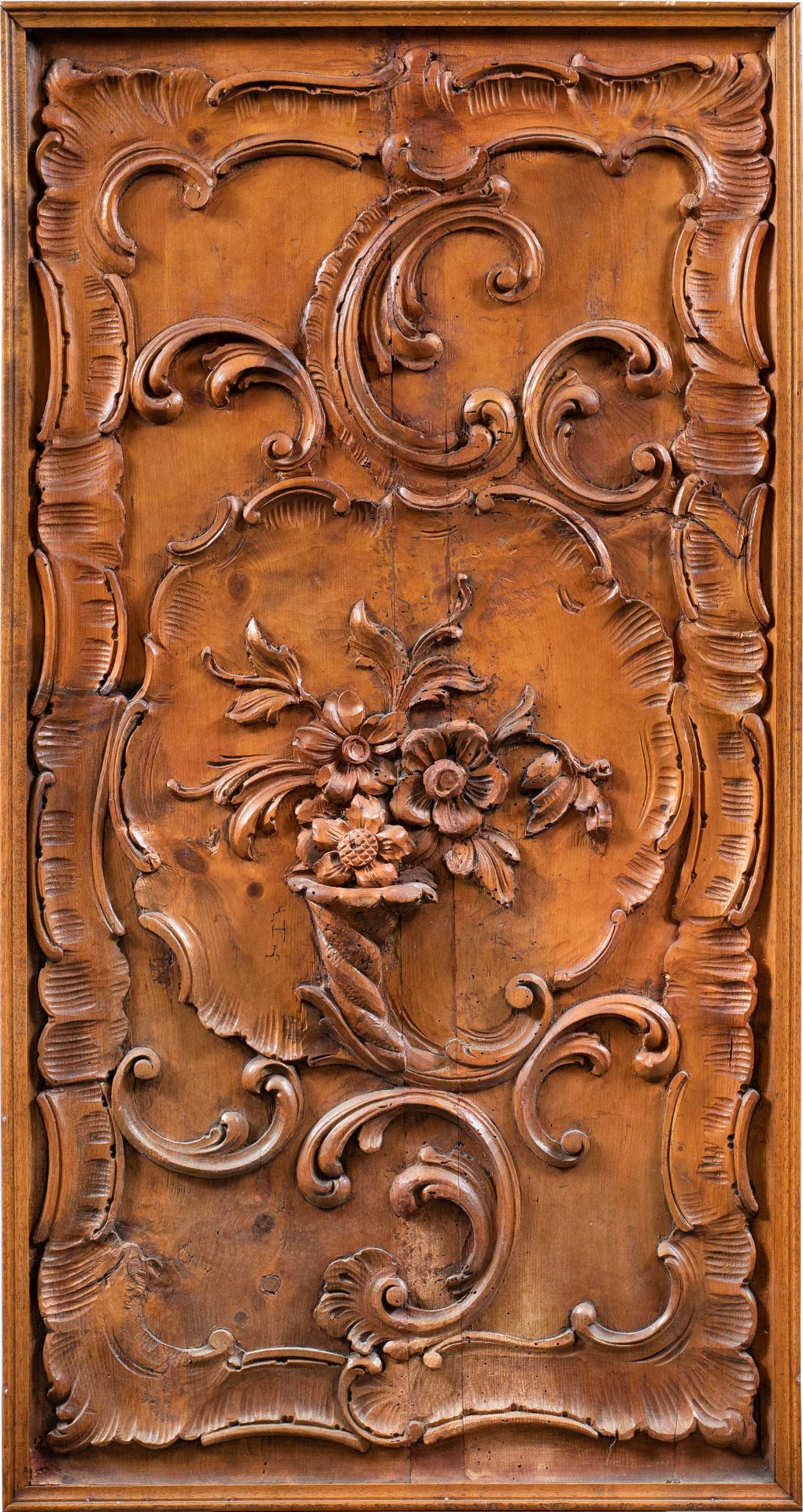 Made entirely of finely carved wood. Rococo-style plant decorations with two cornucopias with flowers in the center.