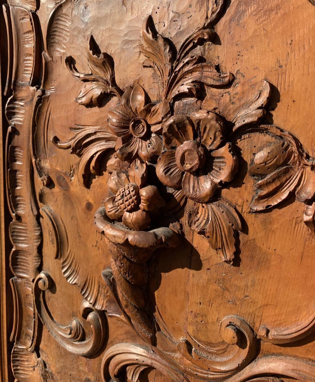 Made entirely of finely carved wood. Rococo-style plant decorations with two cornucopias with flowers in the center.