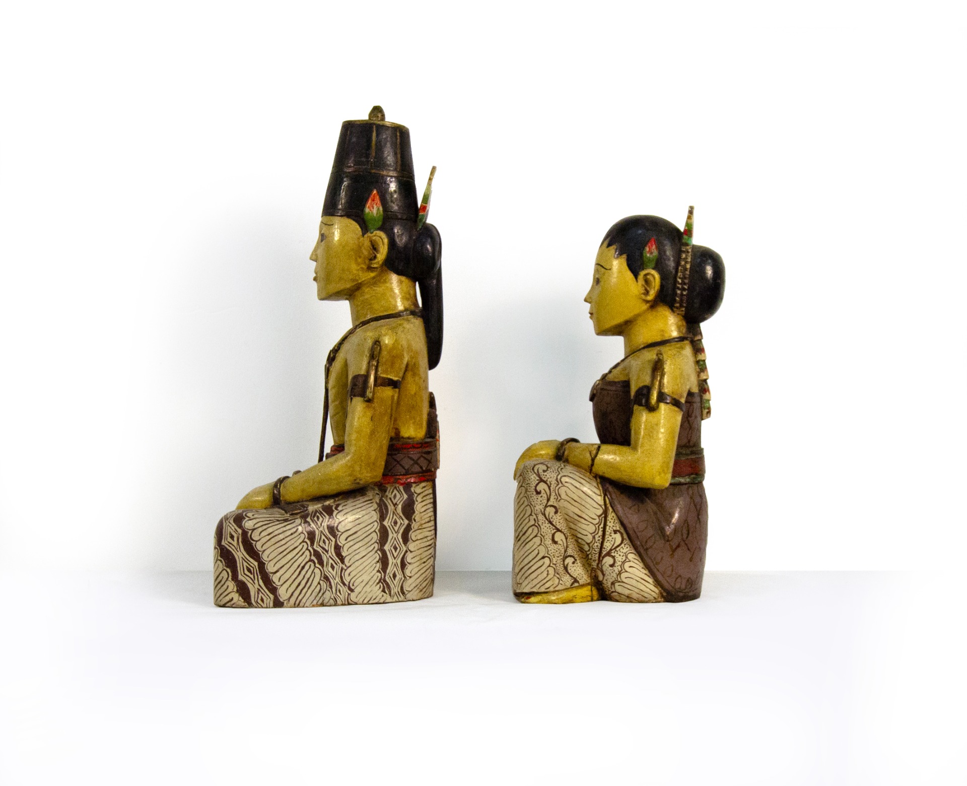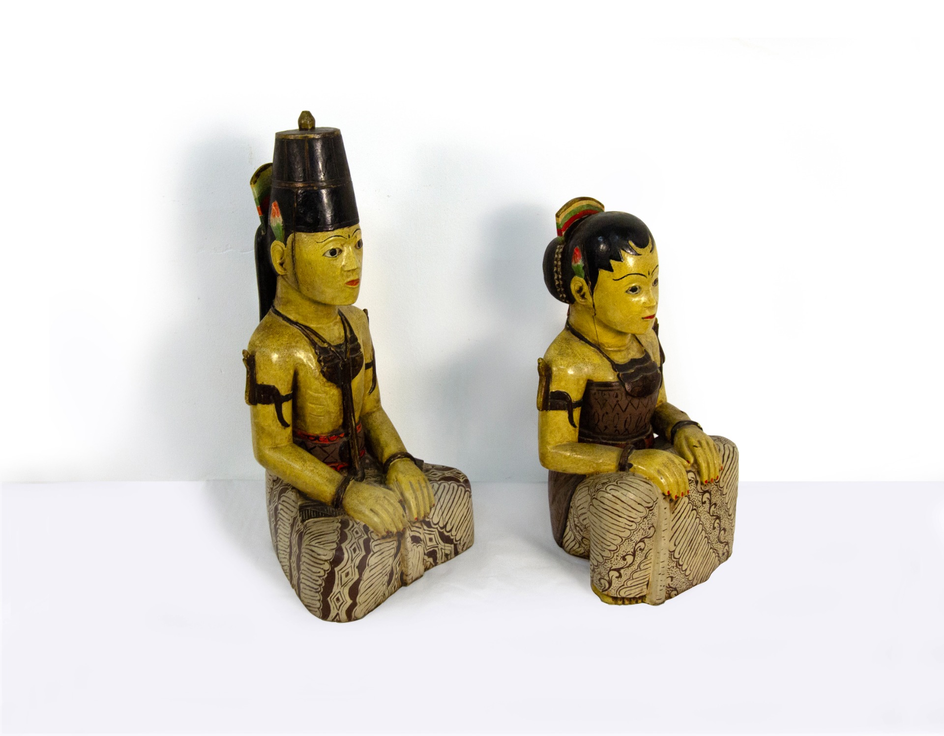 Pair of polychrome wood sculptures, Japan, 19th/20th century, depicting a married couple, seated with traditional clothes and headdresses; heights cm 57; cm 45