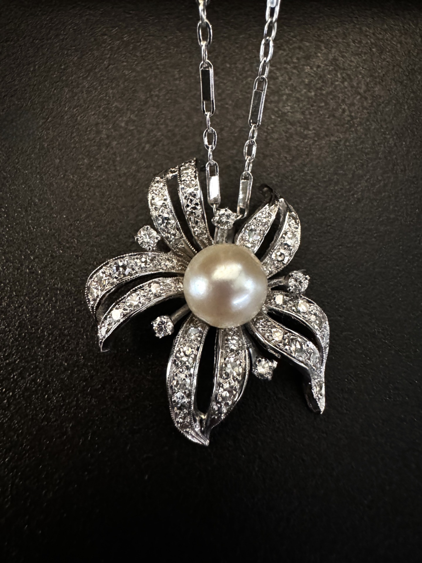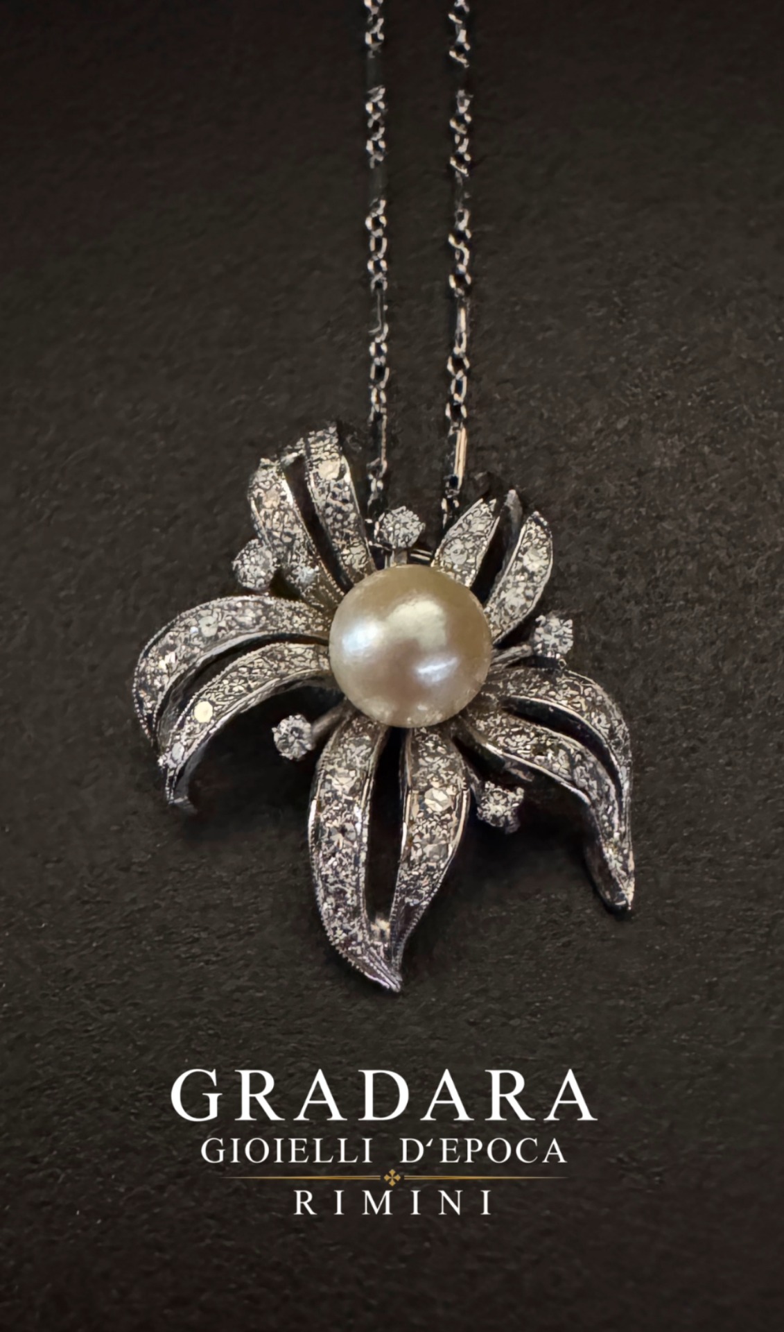 WHITE GOLD PENDANT WITH PEARL AND DIAMONDS – REFINED 1950S STYLE