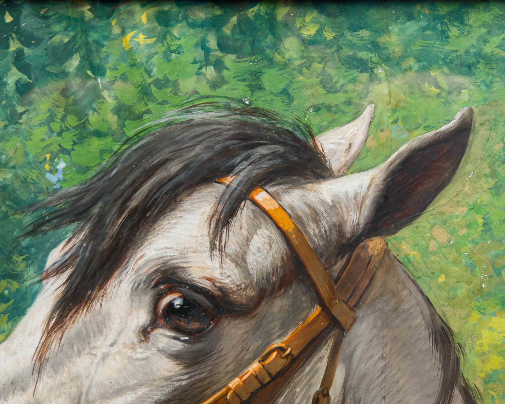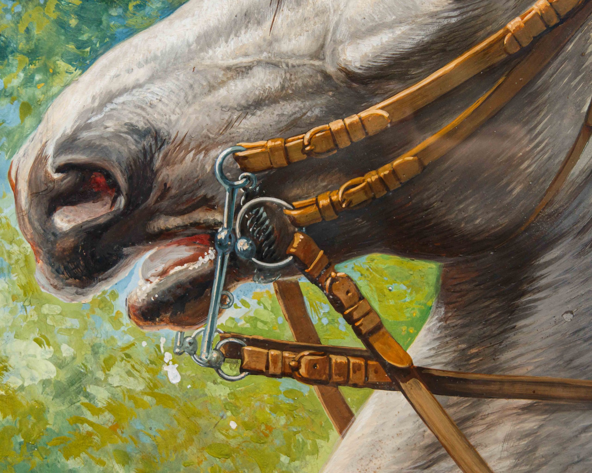His life ended in Paris in 1940, a year marked by the German occupation of the city. Despite the scarcity of detailed news about his education and stylistic path, his surviving works testify to his ability to represent scenes and figures of his time with immediacy and precision. Cajani's interest in the equine world, specifically, and the scenes related to it is a distinctive element of his production, as evidenced by significant works such as Sincere Friendship, now preserved at the Museum of Modern and Contemporary Art of Varese or at Al lazo, in a private collection. In his works, such as the one under examination signed and dated 1913, he reveals a realistic and material pictorial approach, typical of his time: the brushstroke is not blurred, but is evident and full-bodied, characterized by rapid strokes juxtaposed that contribute to giving a sense of concreteness and tangibility; the light is applied here to model the bodies, highlighting the anatomy rendered with extreme detail and naturalness. Through this vigorous and realistic technique, Cajani manages to capture not only the external appearance of the horse, but also to suggest its energy and vital role.