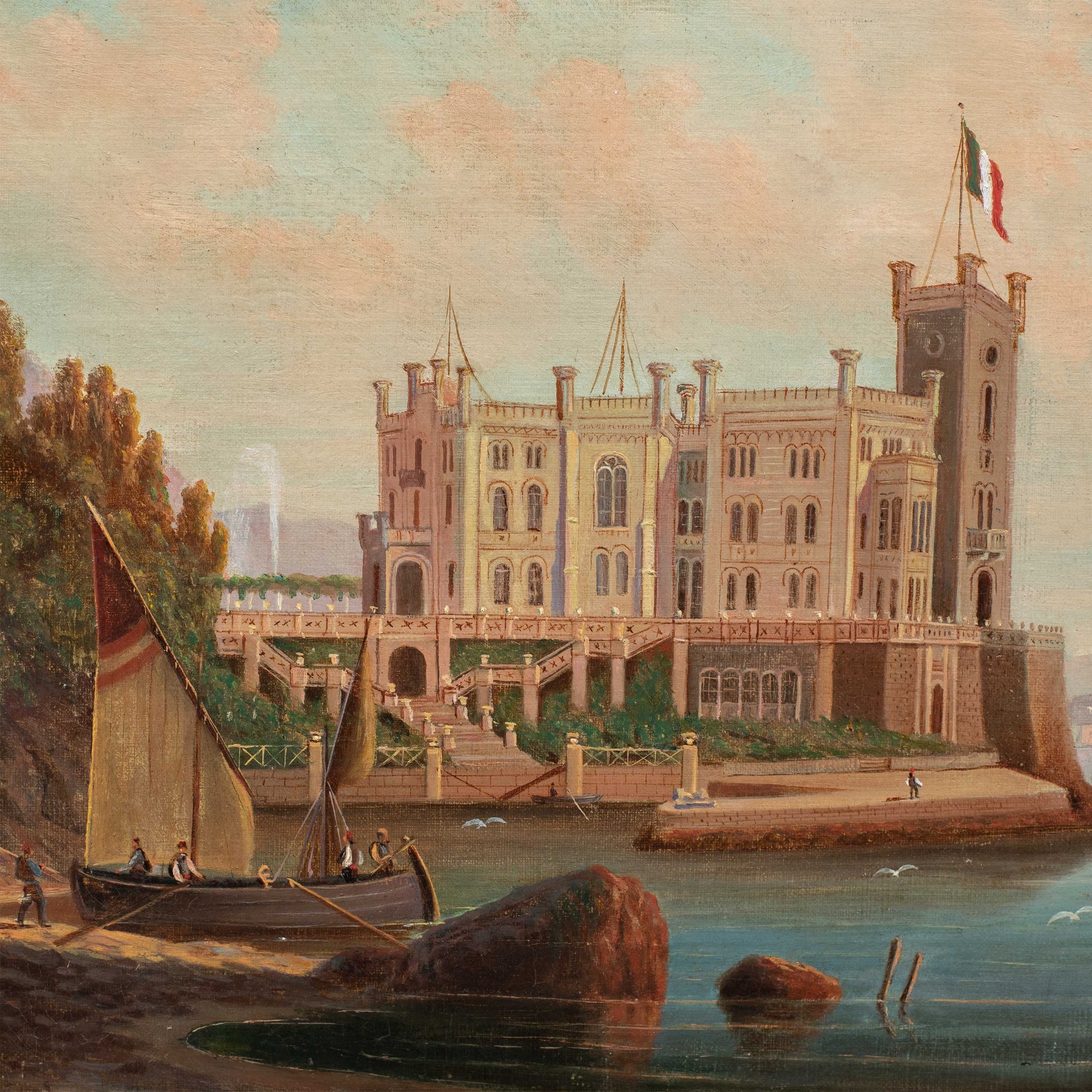 Italian painter (early 20th century) - Trieste, view of Miramare Castle with the Italian flag.