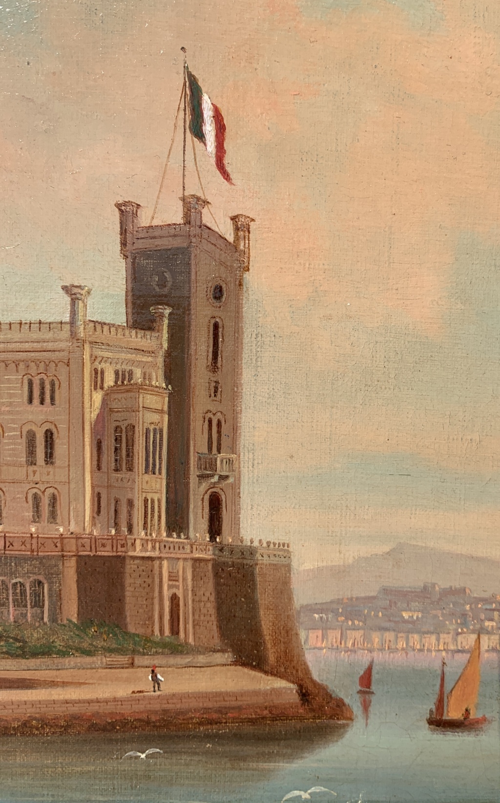 Italian painter (early 20th century) - Trieste, view of Miramare Castle with the Italian flag.