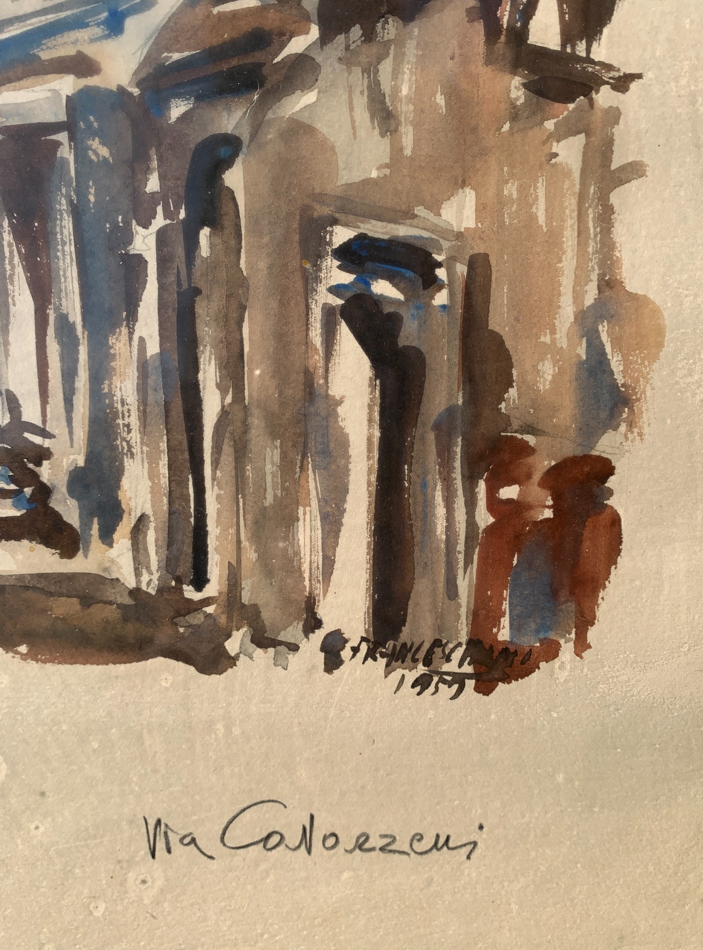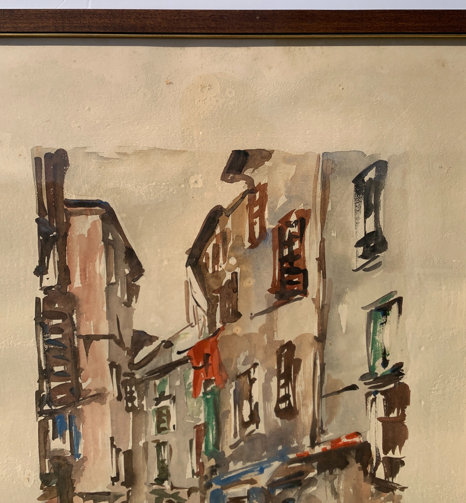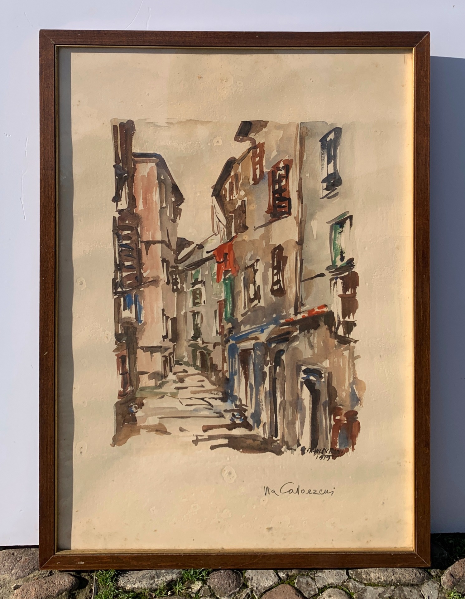 Trieste painter (dated 1959) - Via dei Cavazzeni in Trieste. 69 x 49 cm without frame, 72 x 52 cm with frame. Watercolor on paper, in a wooden frame. - Work signed “Franceschini, 1959”. - Inscription: “Via Cavazzeni”. Condition report: Good condition, signs of aging and wear are present. - All shipments within the EU are free and professionally packaged. - Each item is sold with a certificate of authenticity with legal validity. - Further details on the condition report are available upon request. - Viezzi Arte guarantees quality and professionalism at competitive prices, contact us at info@viezziarte.it or via WhatsApp at +39 3402841279. *Message to non-Italian buyers: Please note that this work has not yet obtained the free export certificate from Italy at the Superintendency of Cultural Heritage. This document certifies that the work is not part of the Italian cultural heritage. Normally, the release times for the certificates are 40 days from the appointment date. The new legislation in force since 2021 provides, for amounts declared less than 13,500€, shorter times at the discretion of the committee of experts. All costs of this operation are included.