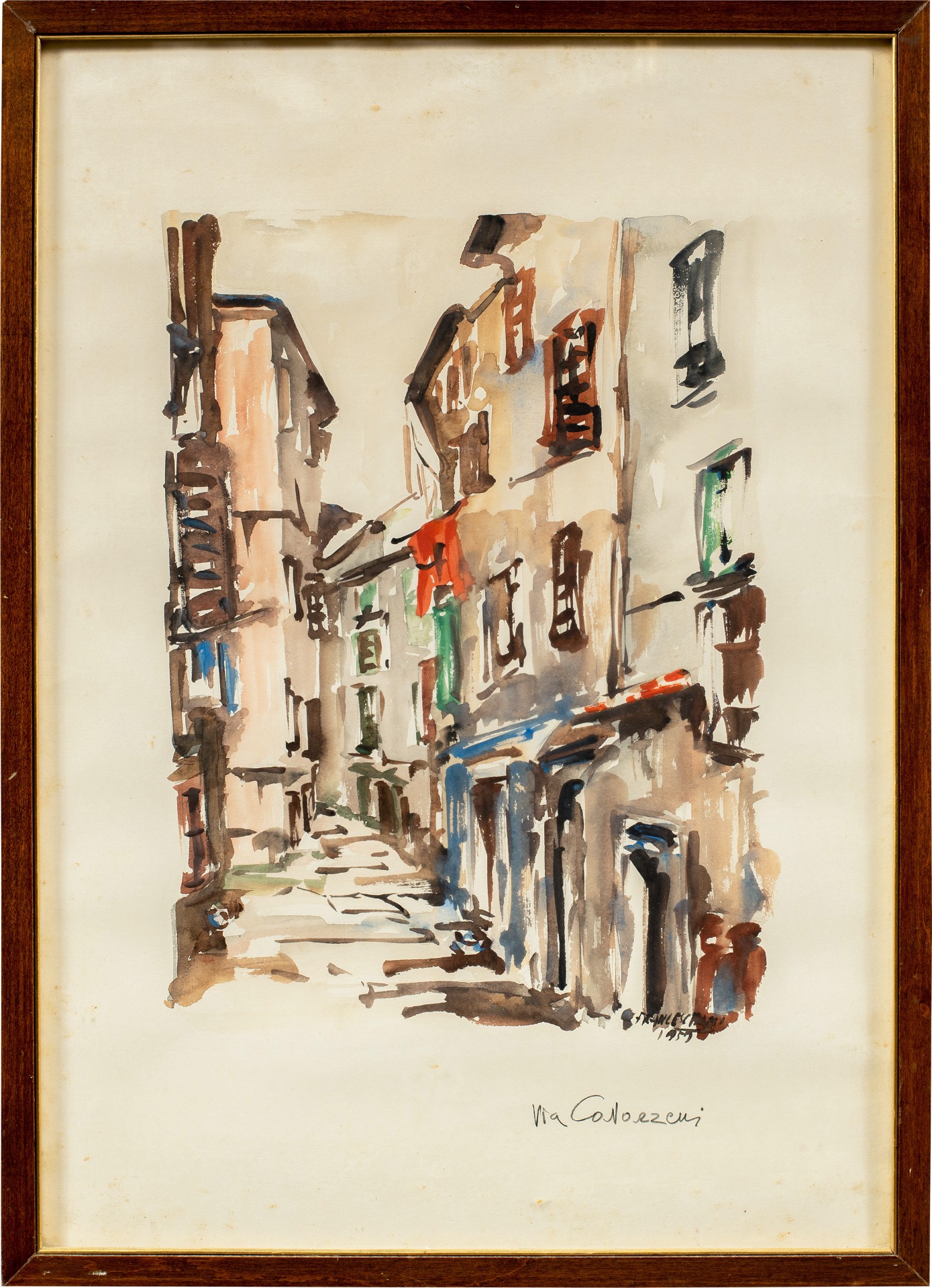 Trieste painter (dated 1959) - Via dei Cavazzeni in Trieste. 69 x 49 cm without frame, 72 x 52 cm with frame. Watercolor on paper, in a wooden frame. - Work signed “Franceschini, 1959”. - Inscription: “Via Cavazzeni”. Condition report: Good condition, signs of...