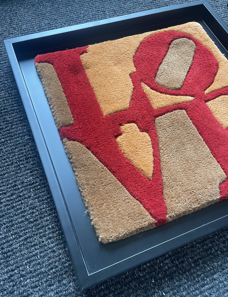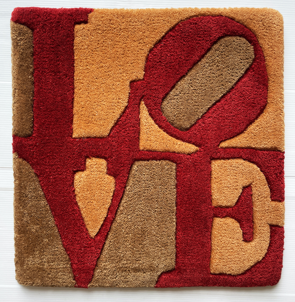 Fall LOVE Rug (2006) by Robert Indiana (1928-2018) Numbered edition 596/00 EXCLUSIVE EDITION FOR GALERIE-F 2006 Technique: Handwoven Material: 100% wool / Hand tufted skein ov. cut wool on canvas with latex backing Year: 2006 Dimensions: 40 X 40 X D 1 cm - With Frame: 48 X 48 X D 4 cm Frame included LOVE, created in 1964 by Robert Indiana, represents one of the icons of Pop Art. This work represents a multiple created under the supervision of John Gilbert, master upholsterer and dyer who has succeeded in bringing LOVE into the environment of many generations.