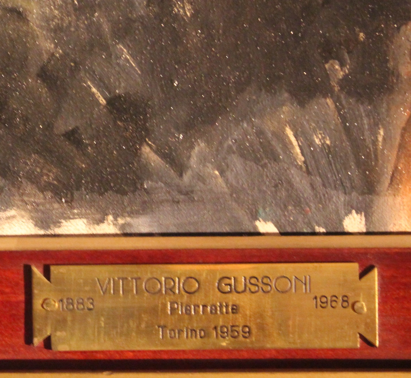 La Pierrotte, in questo caso, incarna una variante femminile del personaggio tradizionalmente maschile, simbolo di candore, solitudine e dolce ingenuità. Gussoni la interpreta con evidente partecipazione emotiva, rimanendo fedele al filone espressivo e sentimentale che caratterizza molte sue opere. Il volto della giovane, delicatamente truccato, è illuminato da una luce calda, che risalta sulle tonalità rosate delle tende e sulla tavolozza morbida e fluente.
