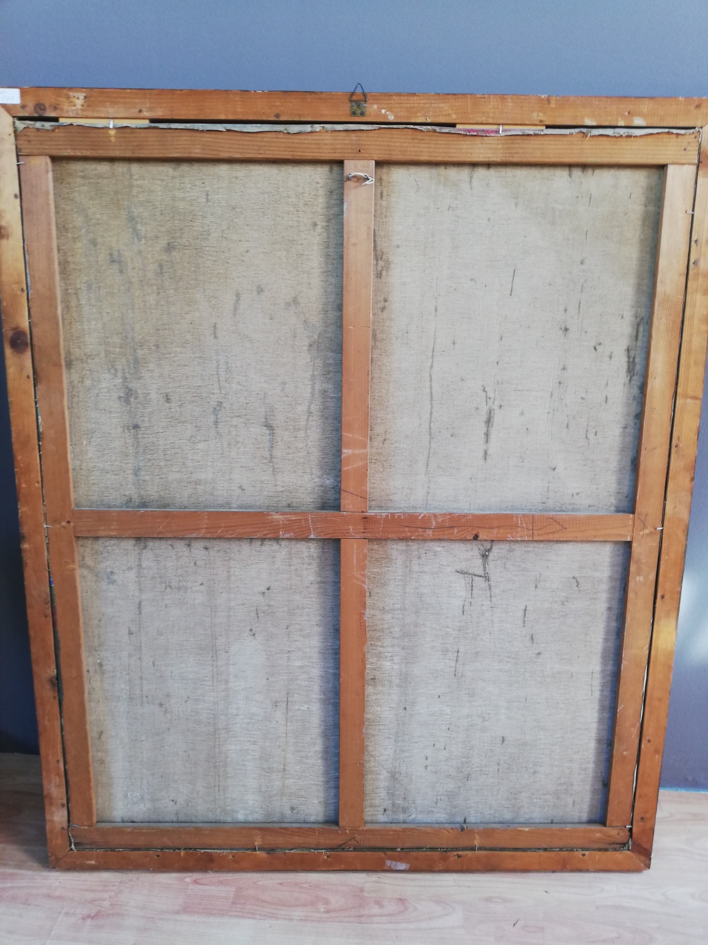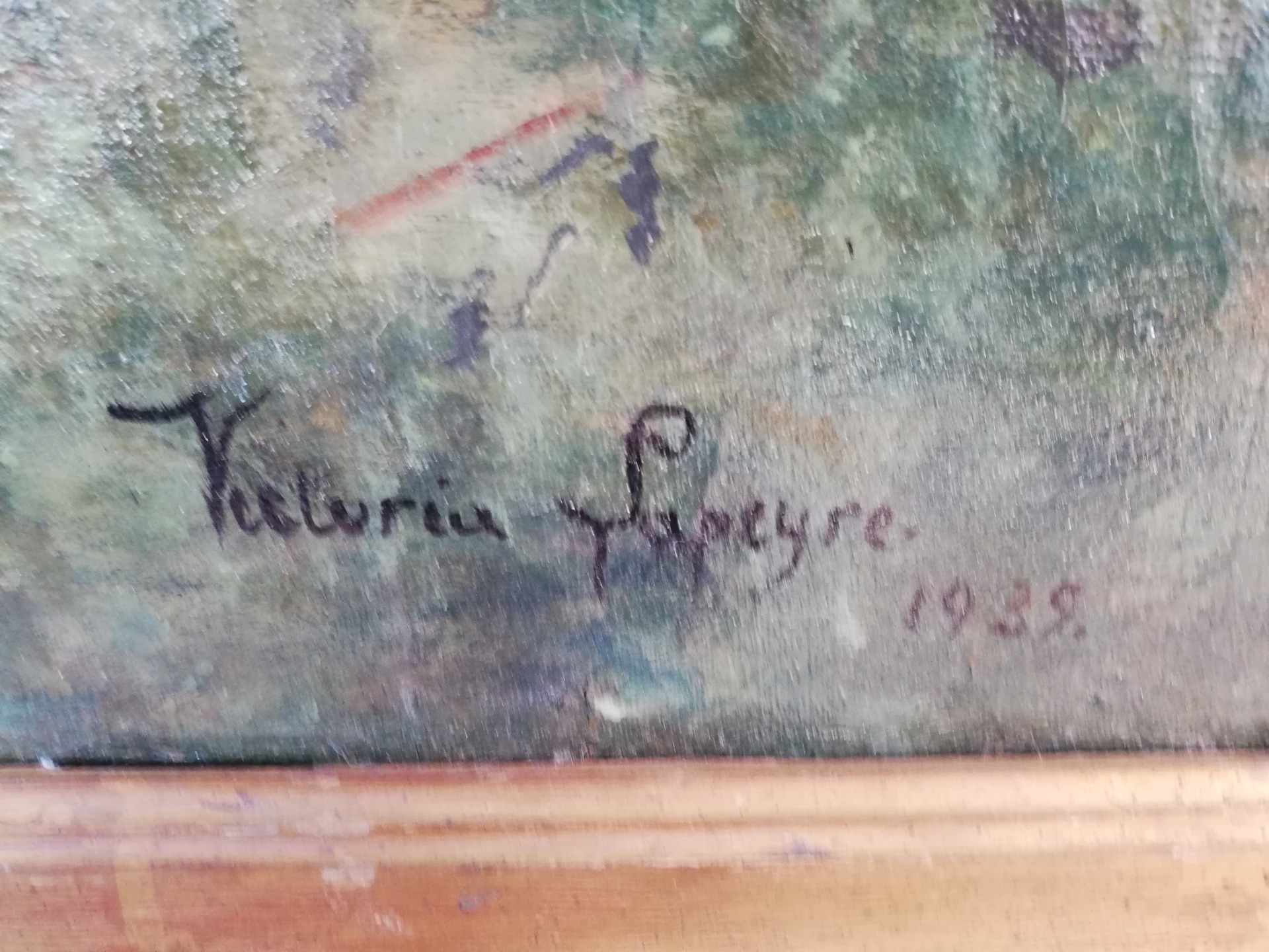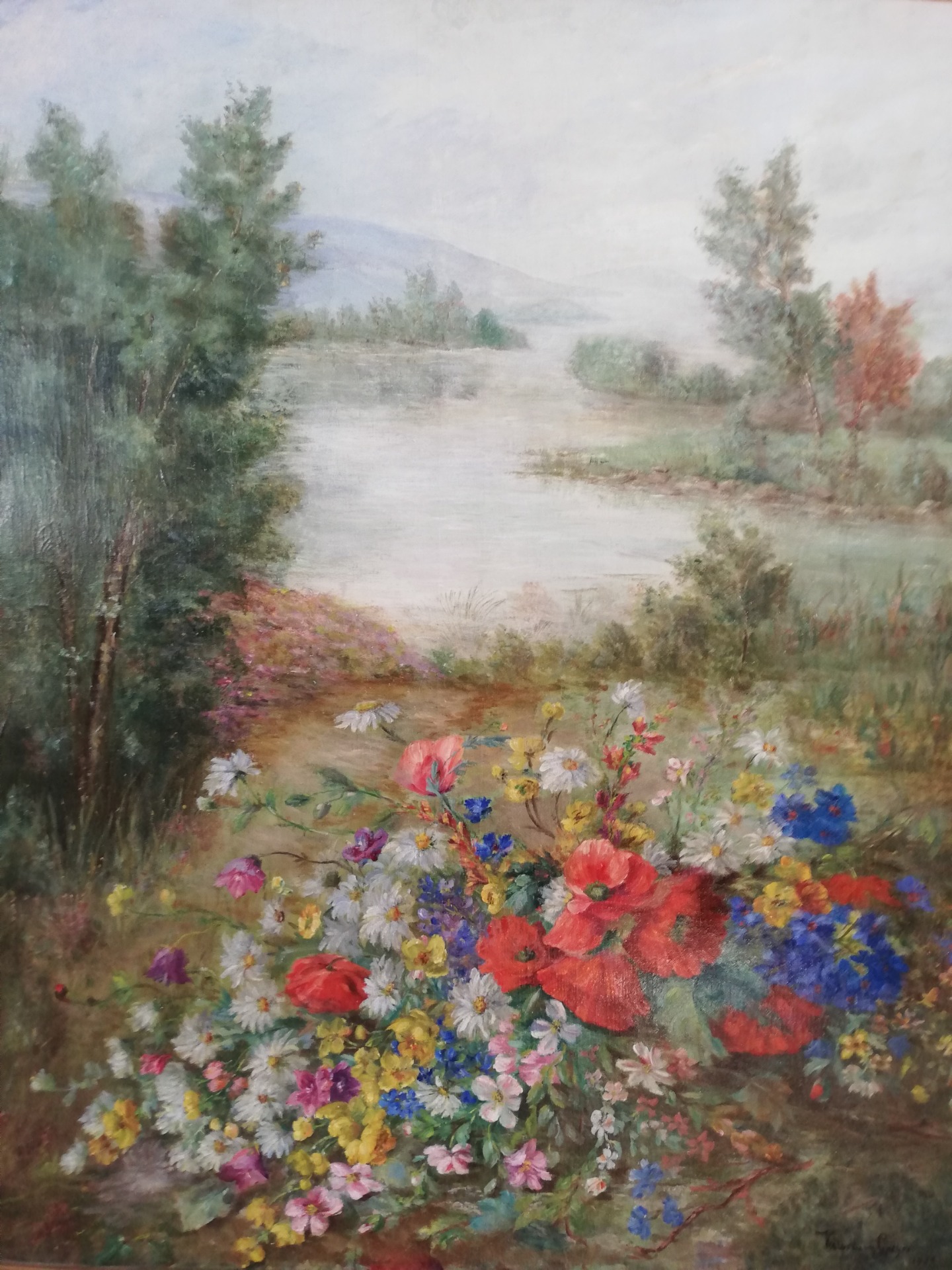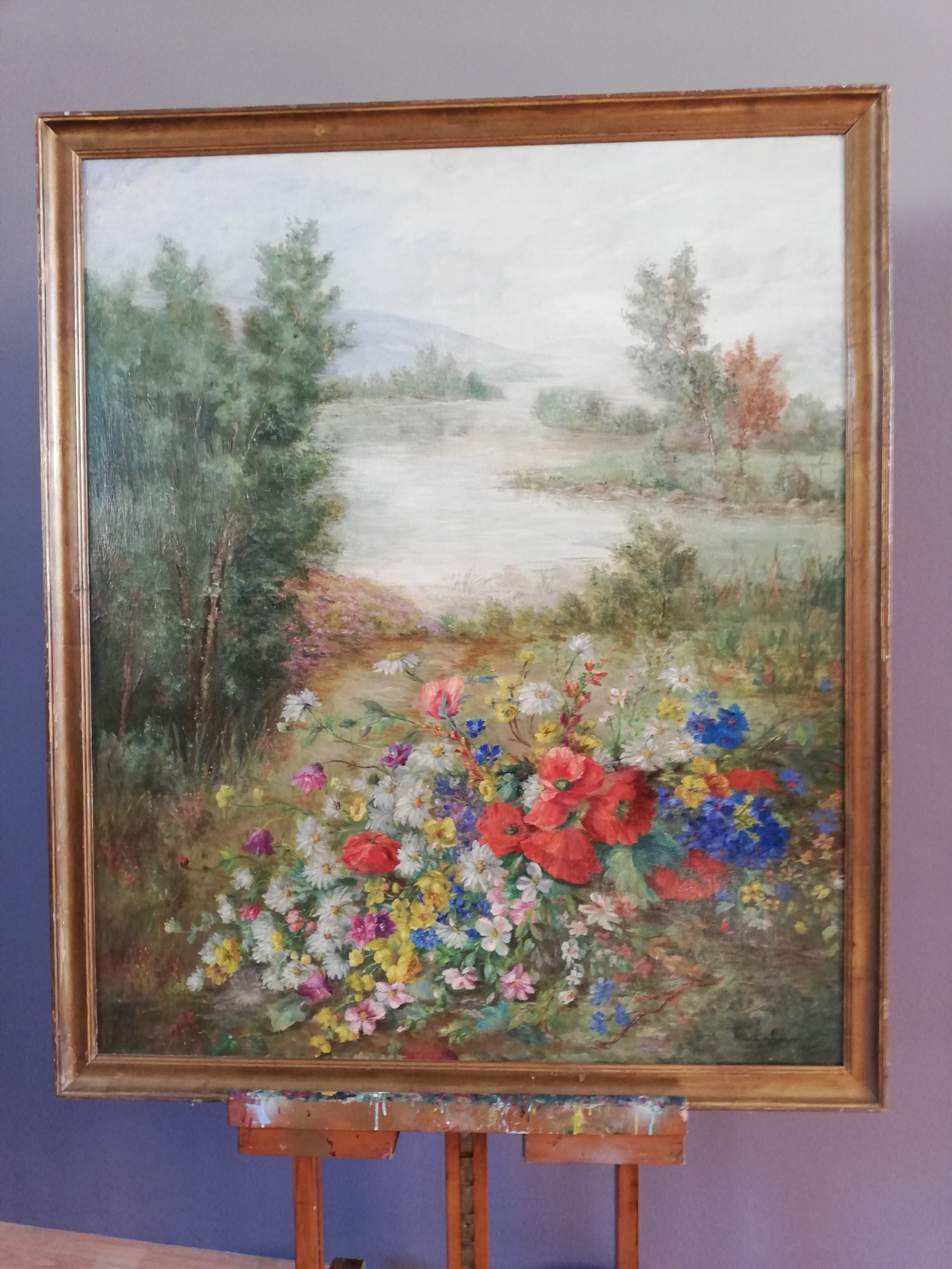 Painting depicting a landscape with flowers, signed and dated. The dimensions are particularly noteworthy. The frame needs restoration. Dimensions: Canvas 110x132 cm, With frame 120x142 cm. We are available for photos or questions. Cell 3282493057 Federico