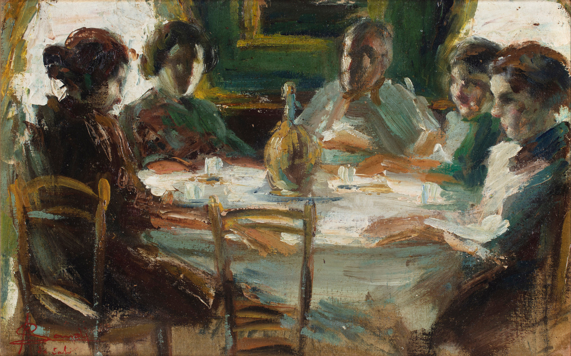 Angelo Landi (Salò 1879-1944), Interno con figure, olio su cartoncino, firmata in basso a destra, misure 29.5x47 cm, con cornice 45x62 cm.