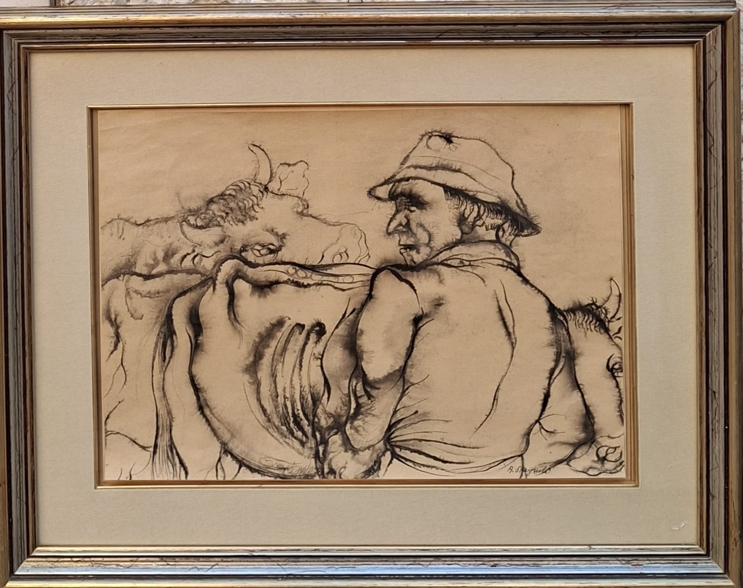 Antonio Stagnoli (1922-2015), Contadino con mucche, china su carta, misure 31x43 cm, con cornice 48x62 cm, firmato in basso a destra, datato a tergo 1979.