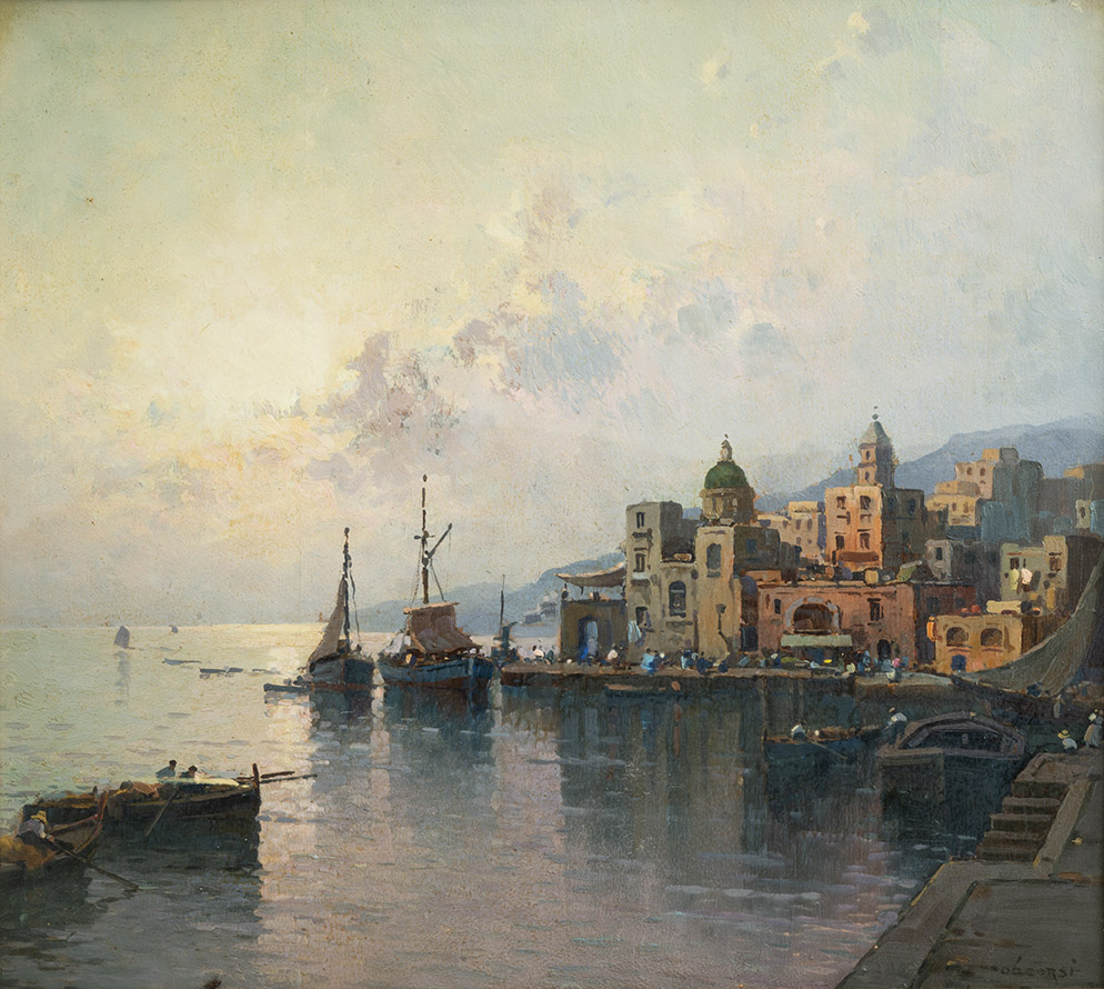 Description: Antique oil on panel painting with contemporary frame signed "Nicolas De Corsi 1882-1956" depicting a view of Torre del Greco. To paint the city, he often uses the watercolor and oil on canvas technique, which best captures its characteristic liquidity. His painting is spontaneous, intimate and natural, and he loves to capture the varied nuances, colors and lights of sunsets or dawns, especially Neapolitan ones. Origin: Naples, early 20th century. General Conditions: Good condition. Measurements: 73x68cm. Document: Certificate of Authenticity. Assistance: We are at your disposal for further clarification or photographic details. Shipping: Throughout Italy, Europe and the Rest of the World at very low prices, with maximum security and traceable. Shipping will be agreed privately and will not be expensive. We wish you a Good Day. Borrelli Antiques.