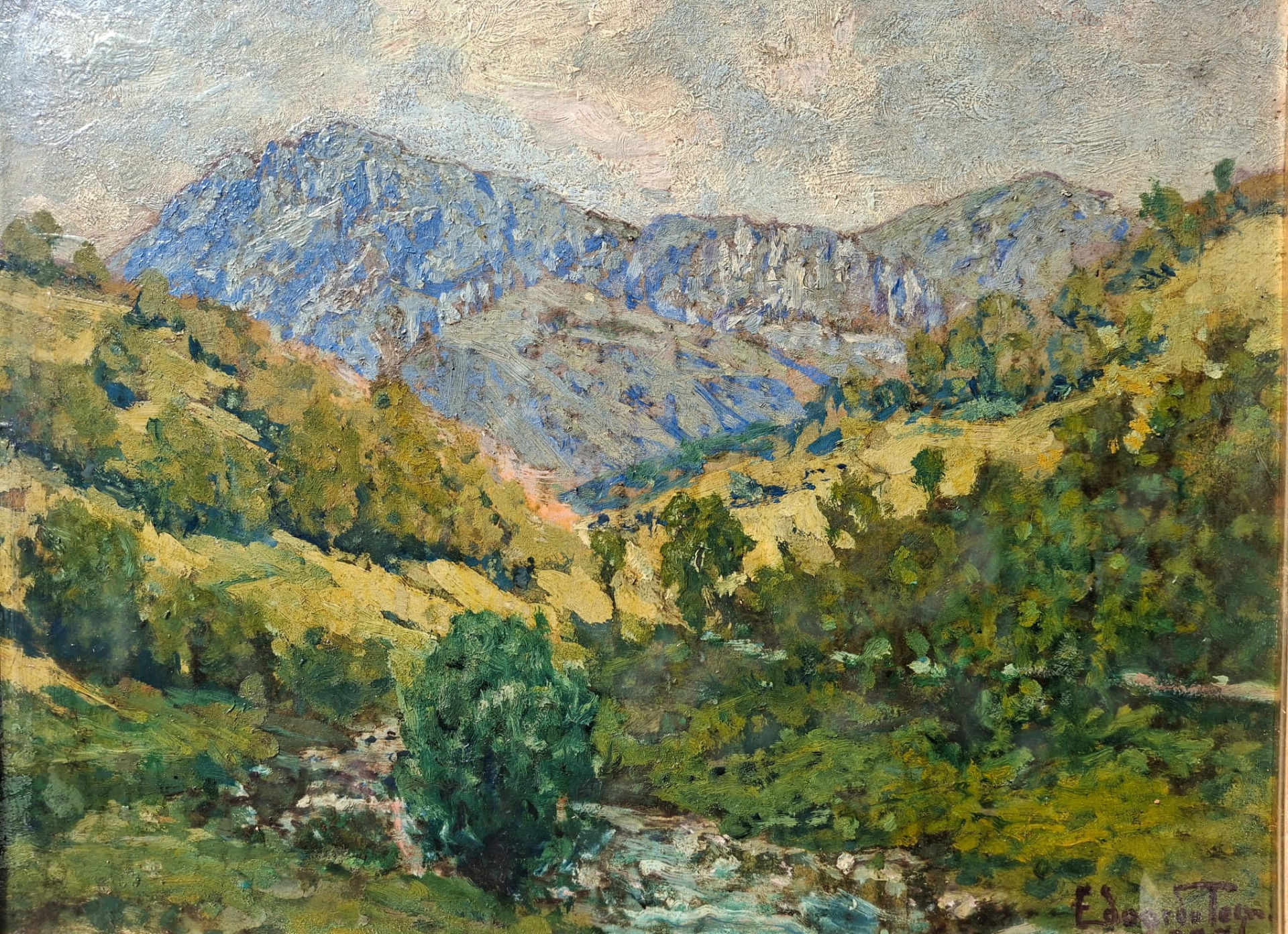 Edoardo Togni (Brescia 1884 - Vestone 1962), Paesaggio montano, olio su cartone, misure 37x46 cm, con cornice 53x63 cm, firmato e datato 1927 in basso a destra. http://www.oldpaintingsonline.com