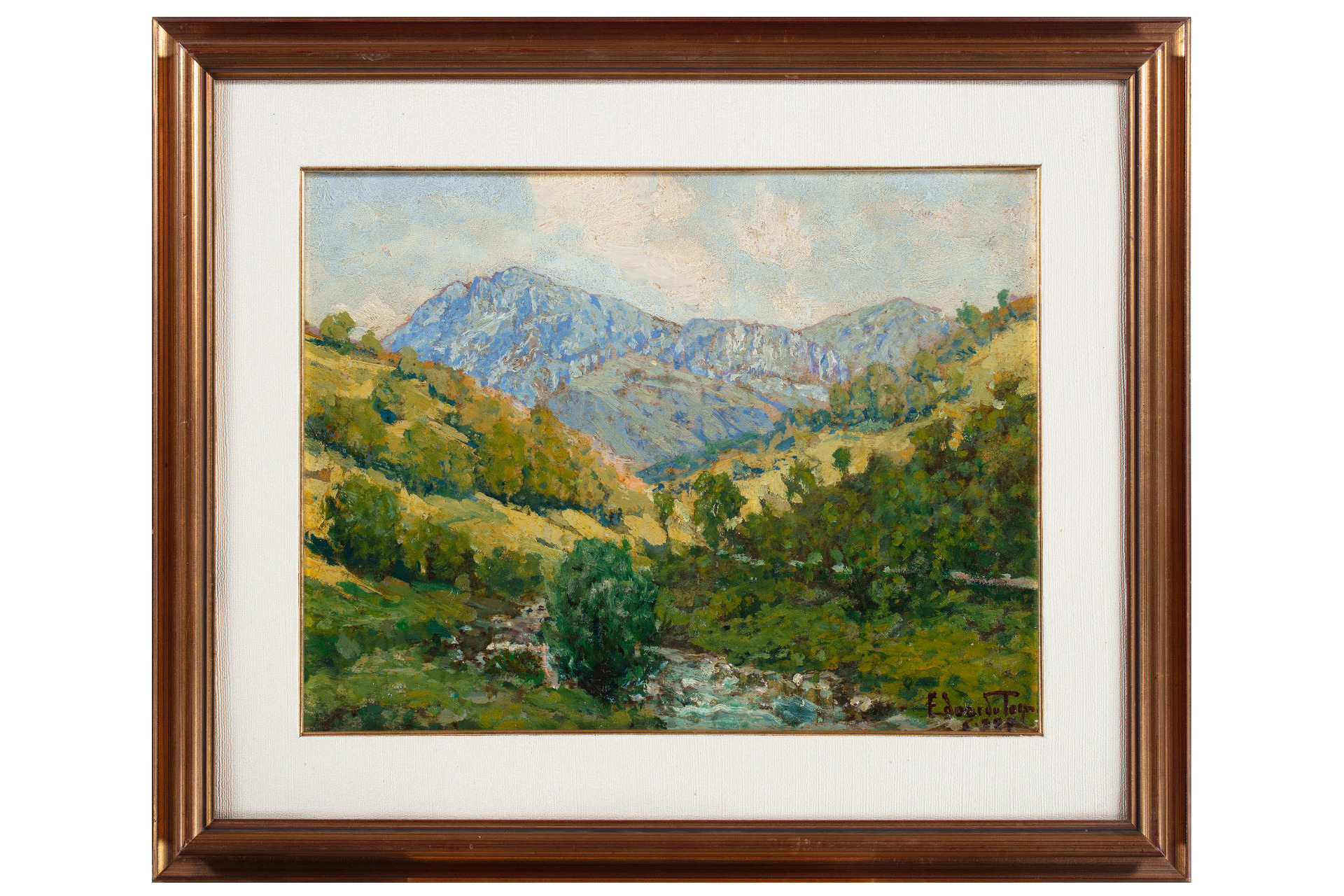 Edoardo Togni (Brescia 1884 - Vestone 1962), Paesaggio montano, olio su cartone, misure 37x46 cm, con cornice 53x63 cm, firmato e datato 1927 in basso a destra. http://www.oldpaintingsonline.com