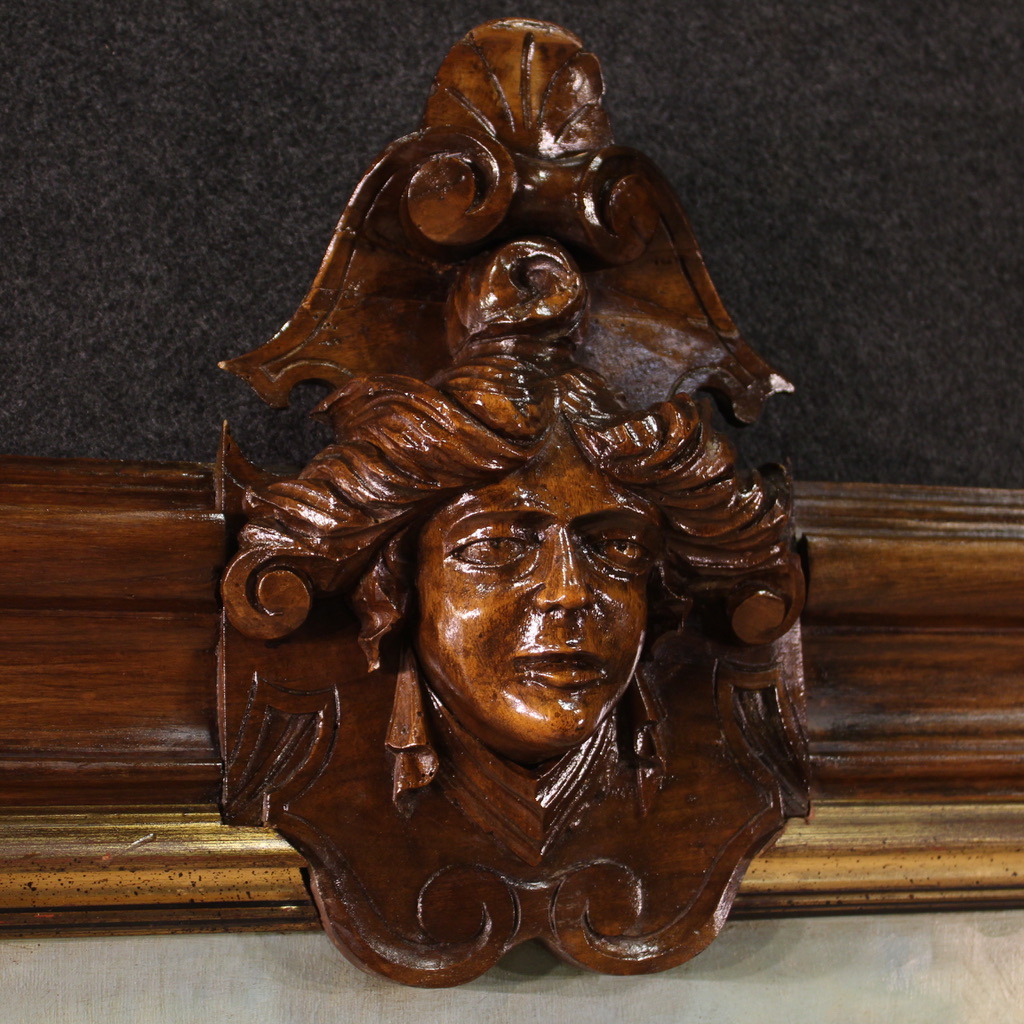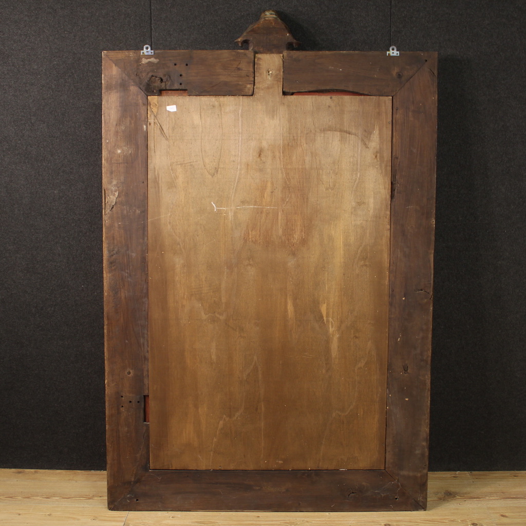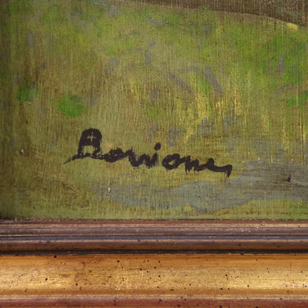 Great Italian painting from the mid-20th century. Oil on board artwork depicting a mountain landscape with river and impressionist-style houses. Painting of exceptional size adorned with a wooden frame with upper mask and golden border (see photo). Good luminosity painting, signed on the bottom left (see photo), signature under study. Artwork of great impact and pleasant decor, ideal for a living room or studio, for antique dealers and interior decorators. In good condition. Sight size H 135 x W 85 cm.