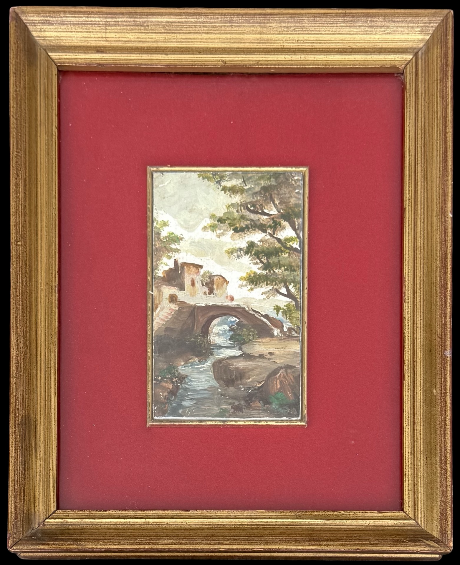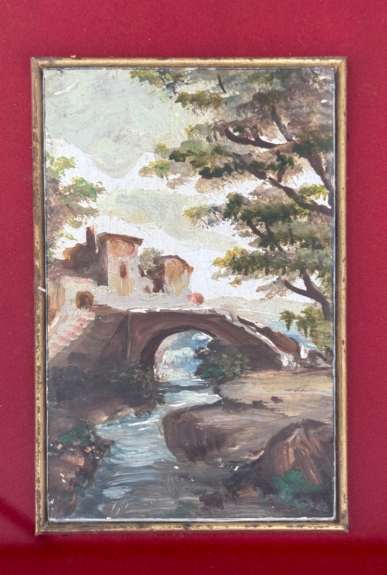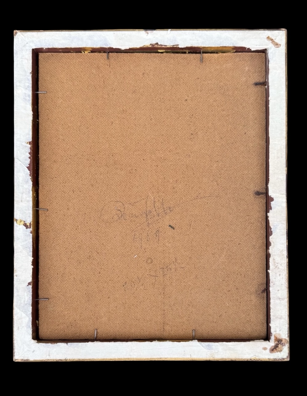 Small oil painting on panel depicting architecture in a rural setting. Signed on the back and dated 1969. Frame: 30x35 cm. Painting: 14x9 cm.