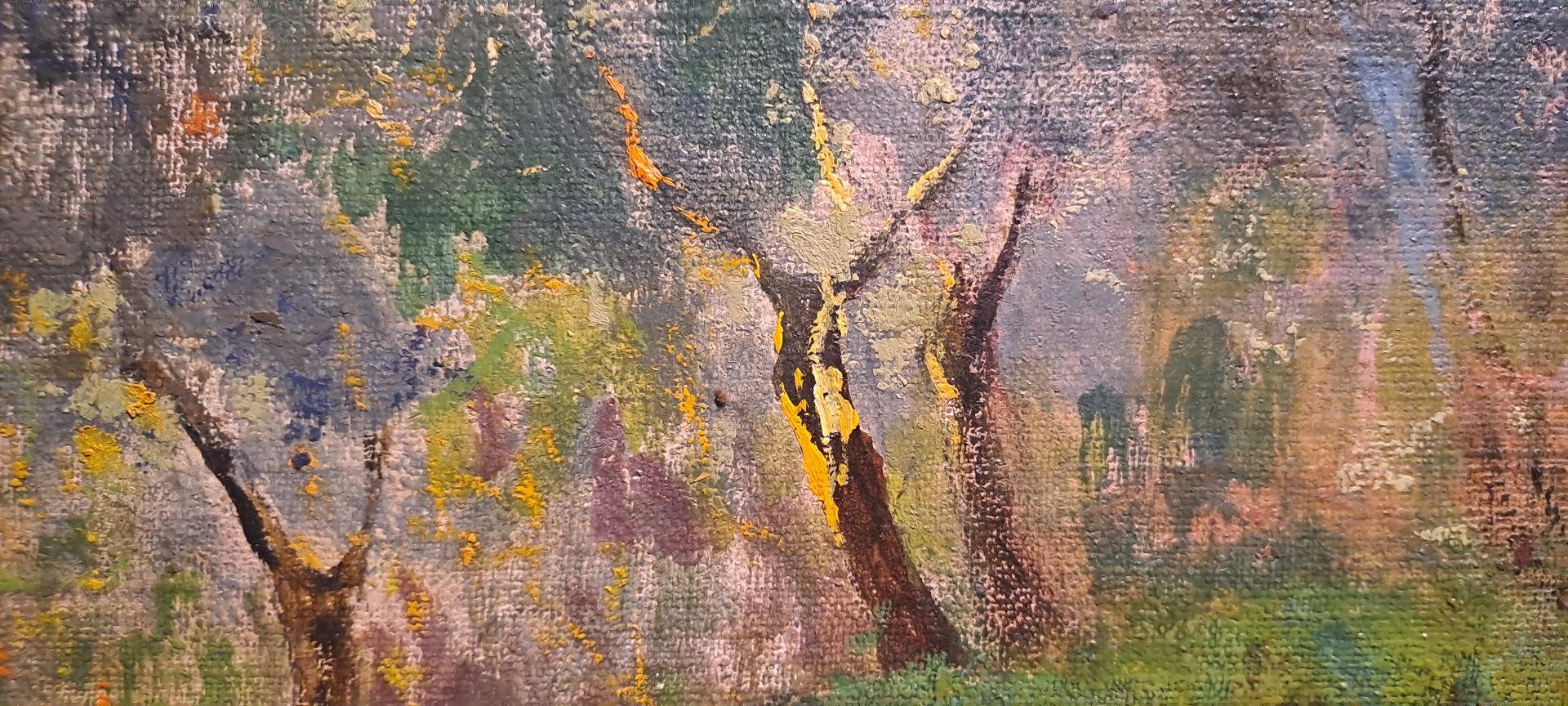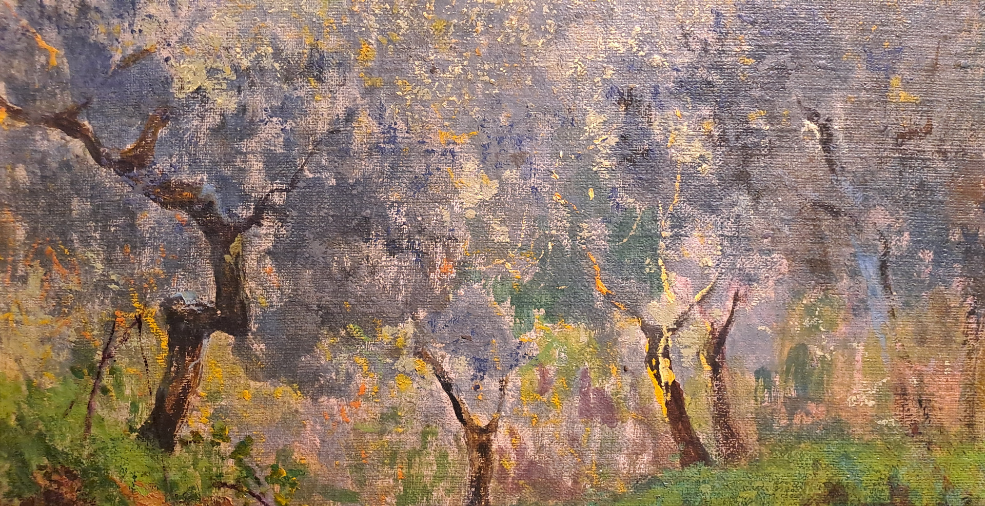 The foreground is dominated by lush vegetation, with a path winding through vigorous olive trees with dark trunks and silvery leaves, rendered with textural touches of green, gray and blue. The brushstroke is charged and fragmented, typical of its evolution towards a more personal language close to the impressionist currents.