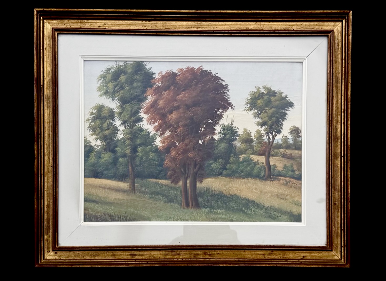Tempera painting on cardboard with woodland landscape. Bruno Furlotti signature.
