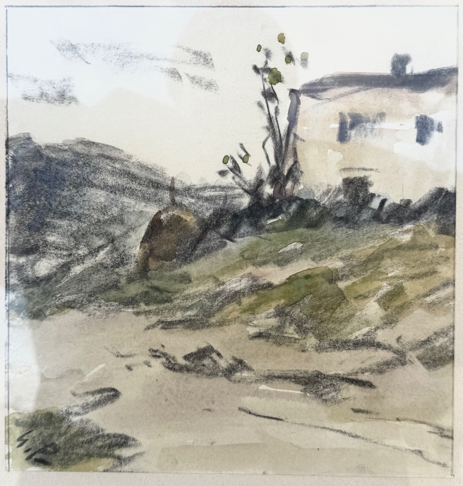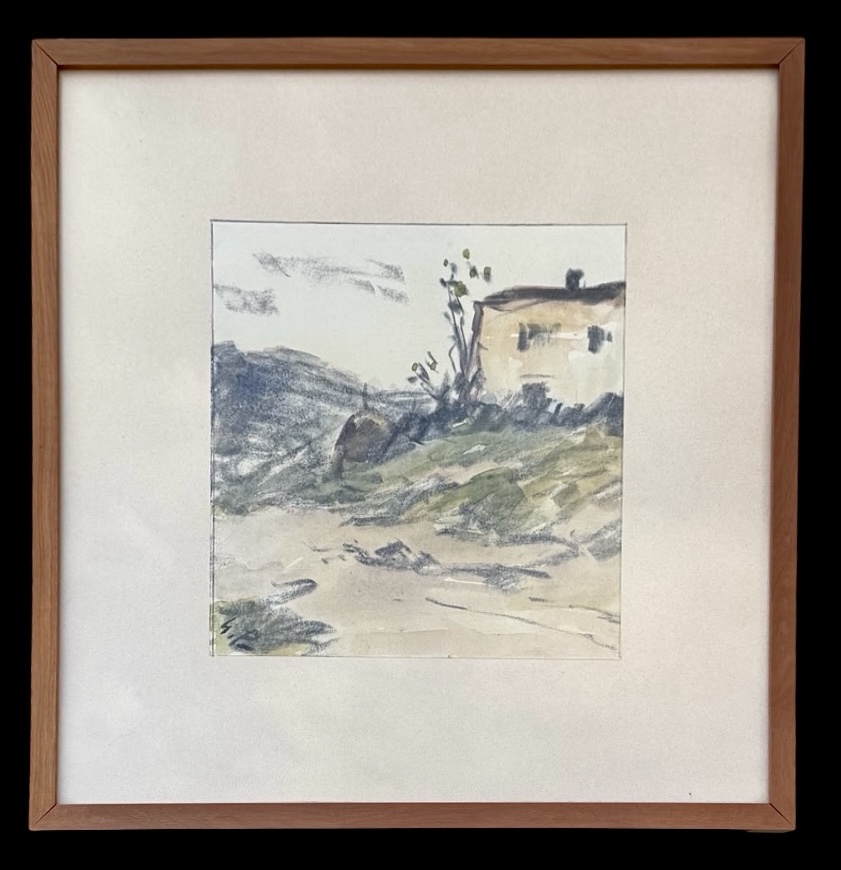 Watercolor-charcoal on paper depicting a rural landscape with a house. Signed.
