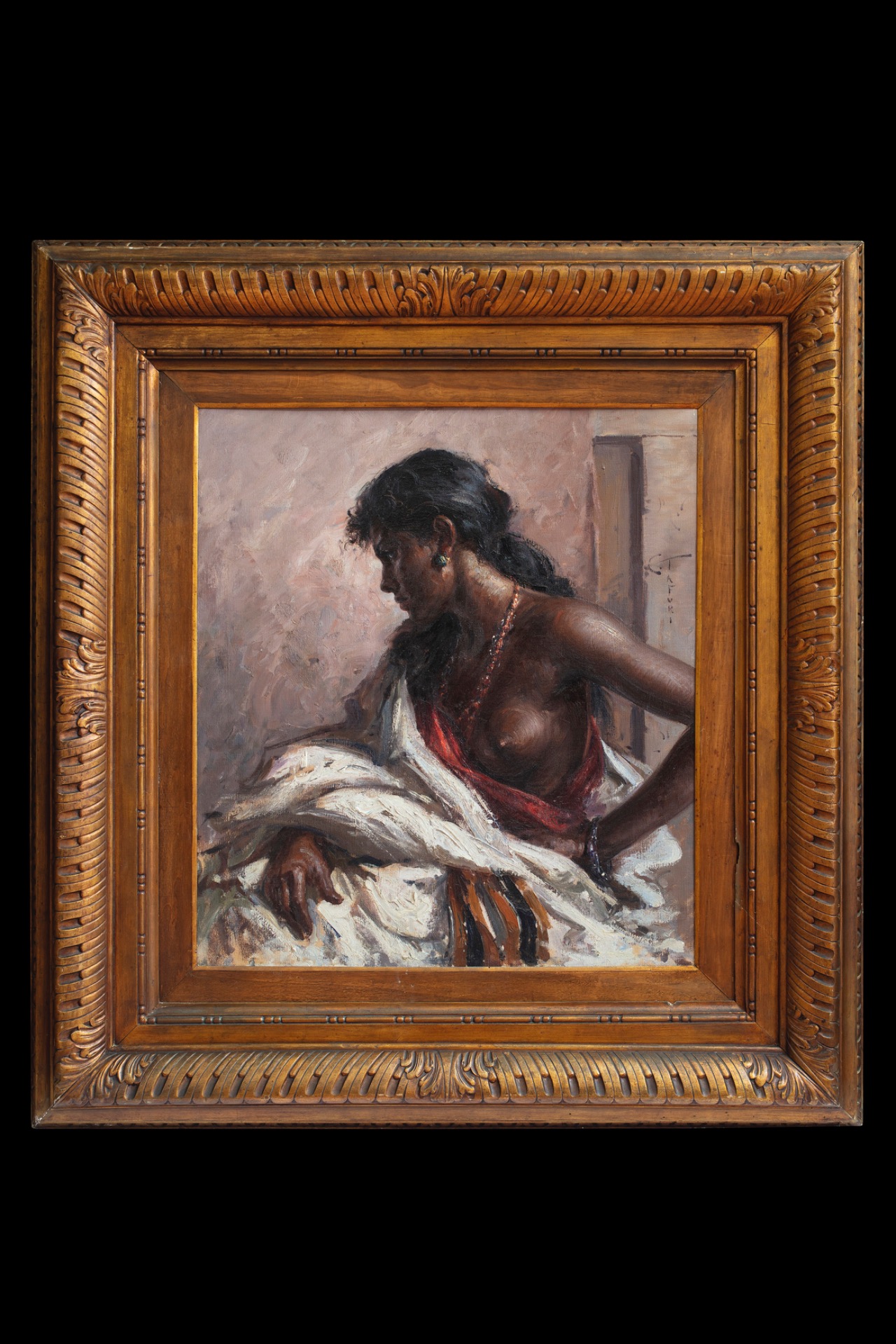 In this visually striking work, a half-length figure of a woman emerges from the violent brushstrokes of Clemente Tafuri. The woman, who holds one arm crossed on her hip and gazes downwards, has a contemplative and focused attitude. The interior is shrouded in a reddish darkness, which makes the dense colors on the canvas shine. The female subject, of Orientalist and colonial iconography, is often used by the painter. Tafuri's sharp and worldly realism gives body to an attractive woman with exotic charm. The loose white fabric dress, in stark contrast to the woman's complexion, highlights her slender neck and décolleté, left uncovered by her long hair, which is gathered behind her back. A bracelet, an earring, and a necklace glitter on her bare skin, accessories that allude to the woman's probable magical profession.