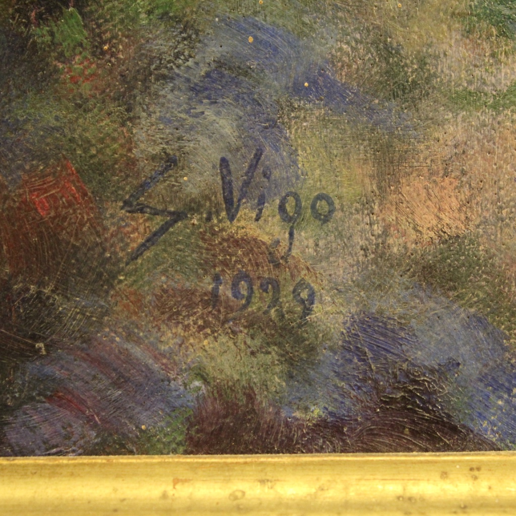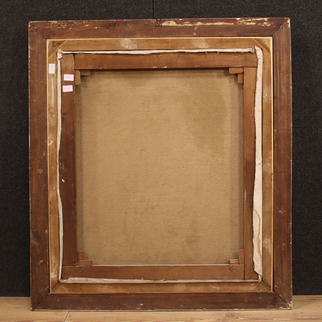 Italian painting dated 1929. Oil on canvas framework depicting Madonna of excellent pictorial quality. Nice size and pleasant impact painting, characterized by bright colors, good brightness. First canvas painting, signed and dated lower right (see photo), signature in the study phase. Wooden frame carved, lacquered and gilded with some small color drops (see photo) structurally sound. Painting for antique dealers, interior decorators and collectors of Italian painting of the first half of the 20th century. In good condition and in a nice patina. Sight size H 78.5 x W 68.5 cm.