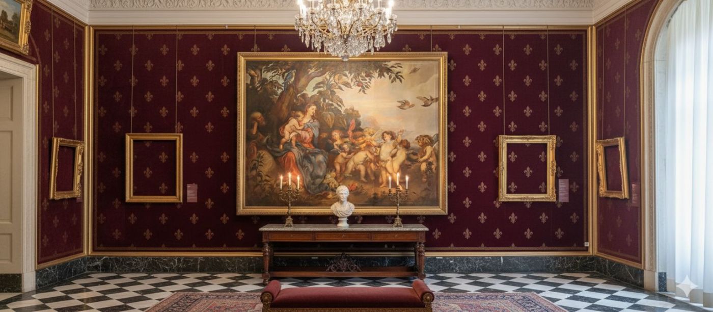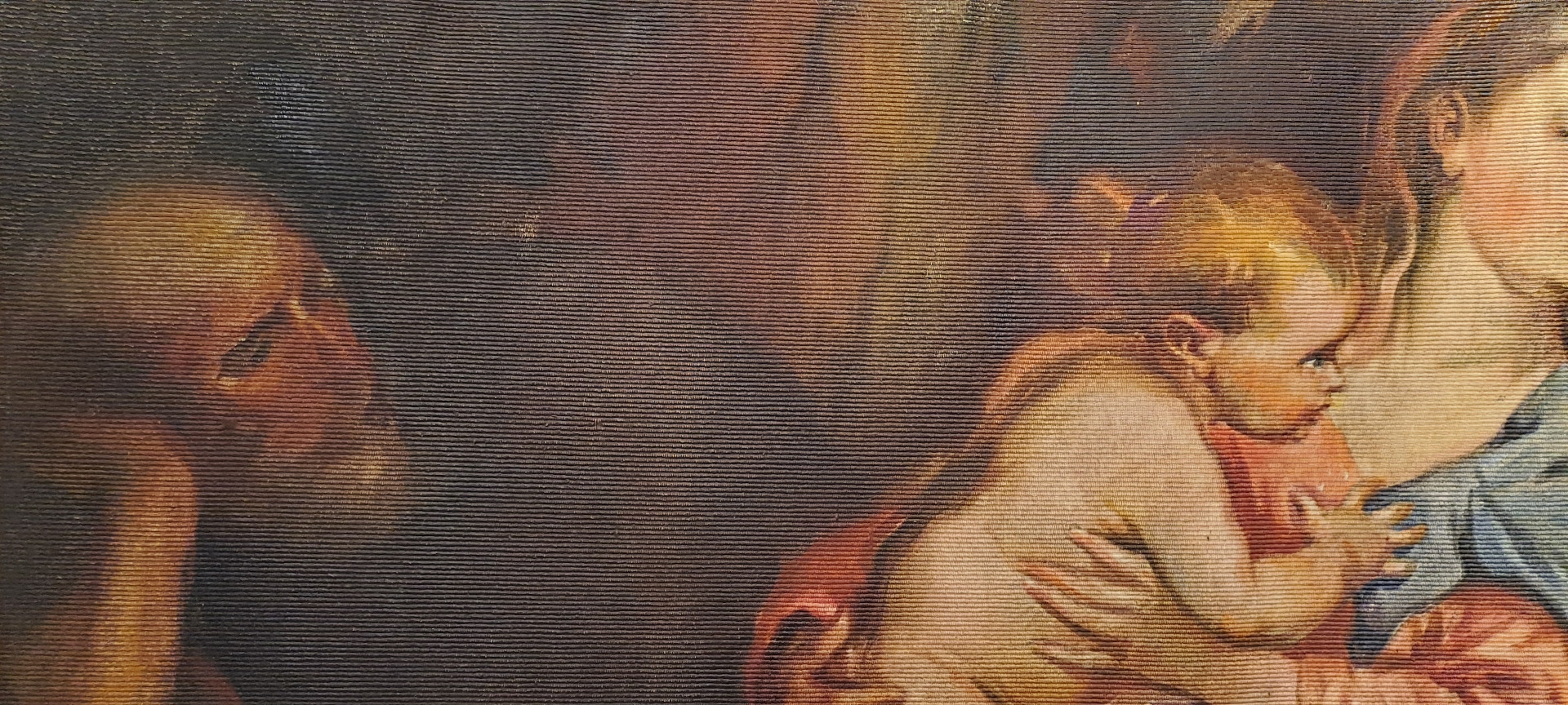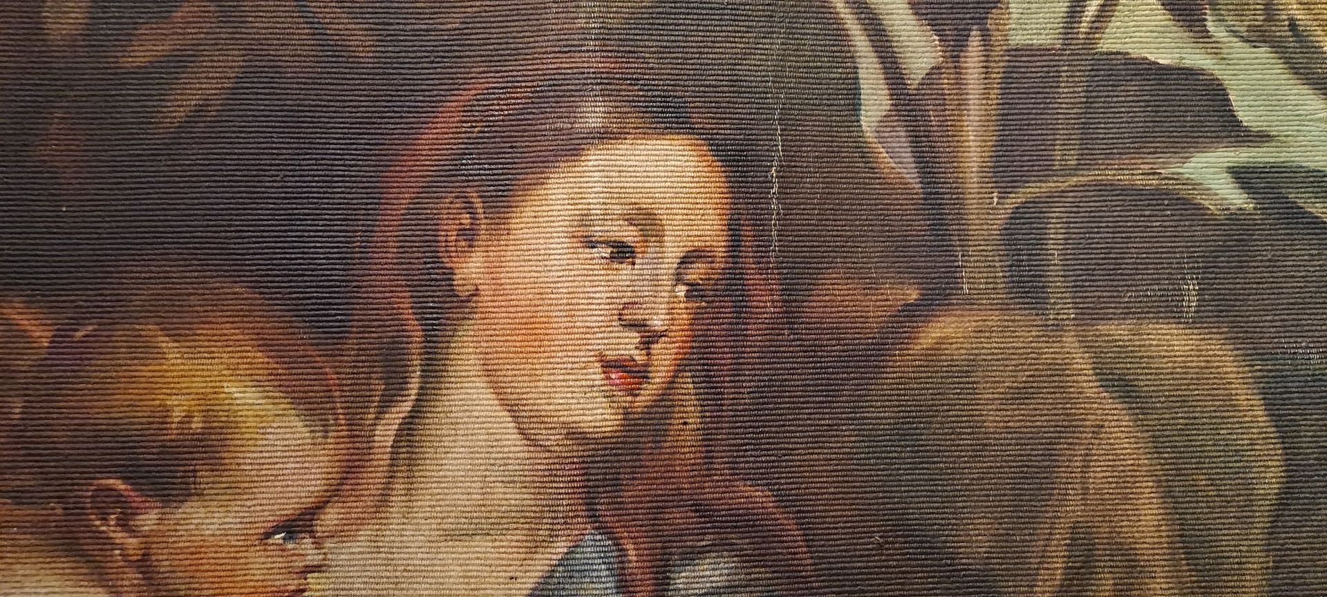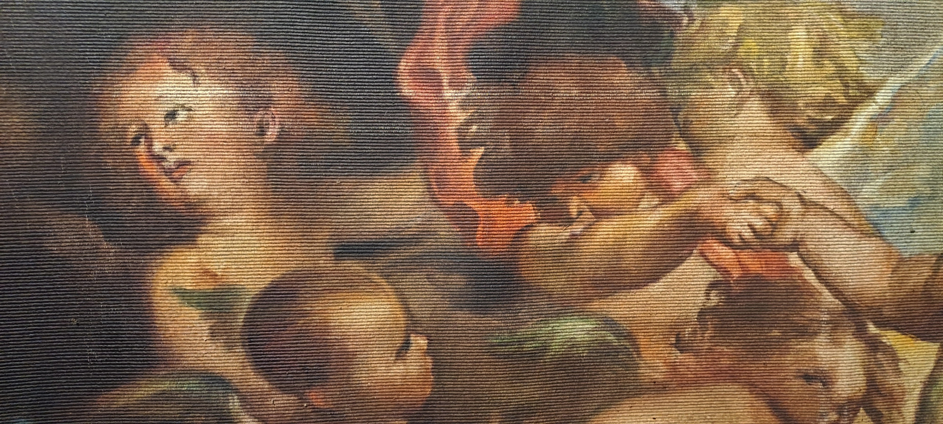Descriptive Sheet of the Artwork: Rest during the Flight into Egypt Subject: Rest during the Flight into Egypt (Holy Family with Angels/Putti). Technique: Oil on Canvas (or fabric with visible weave, as per detail). Period: 20th century. Stylistic and Iconographic Analysis 1. Iconography and Composition Baroque Dramatism: The scene is a vibrant example of the Baroque style, characterized by a dynamic and crowded composition. In the center is the Holy Family, surrounded by numerous playful putti (cherubs) who interact with the Virgin and Child, a typical element of early 17th-century Flemish compositions. Key Figures: The Virgin Mary is depicted with maternal sweetness, in contrast to Saint Joseph, who is older and more thoughtful, visible in the shadows, an iconographic reference to his role as guardian and protector. Landscape: The rest takes place in a lush and shady natural environment, with thick foliage and branches, typical of Flemish pictorial taste. Some details show red fruits, which may have a symbolic meaning. 2. Technique and Color (Rubensism) Pictorial Corporeality: The work features a rich and full use of color, with brushstrokes that appear vigorous, especially in the anatomical details of the putti. Light and Chiaroscuro: Light plays a fundamental role, illuminating the central figures and creating a strong contrast with the dark and deep background. Color Scheme: The palette is dominated by warm colors (reds, oranges, browns) and rich draperies, particularly the red and blue of the Virgin, which give intensity and emotional depth to the scene. . Description of the Setting and Conditions Dimensions: Large format, making it a work with a strong visual impact. Condition: The work, as a whole, appears well-preserved and framed in a golden frame. Dimensions: 182 x 142 cm including the frame, 168 x 128 cm the canvas alone Period: dated 1961 Signature: Signed in the lower right but not decipherable The "grass juice" technique is a form of painting on fabric (often silk) that was especially popular in the 18th century, created as a more economical alternative to tapestry. Natural plant pigments (such as woad, walnut stain, saffron, or cabbage juice) diluted with fixatives such as alum and lemon juice are used, which give a pictorial result similar to watercolor. The color is applied several times to allow it to be completely absorbed by the fabric.