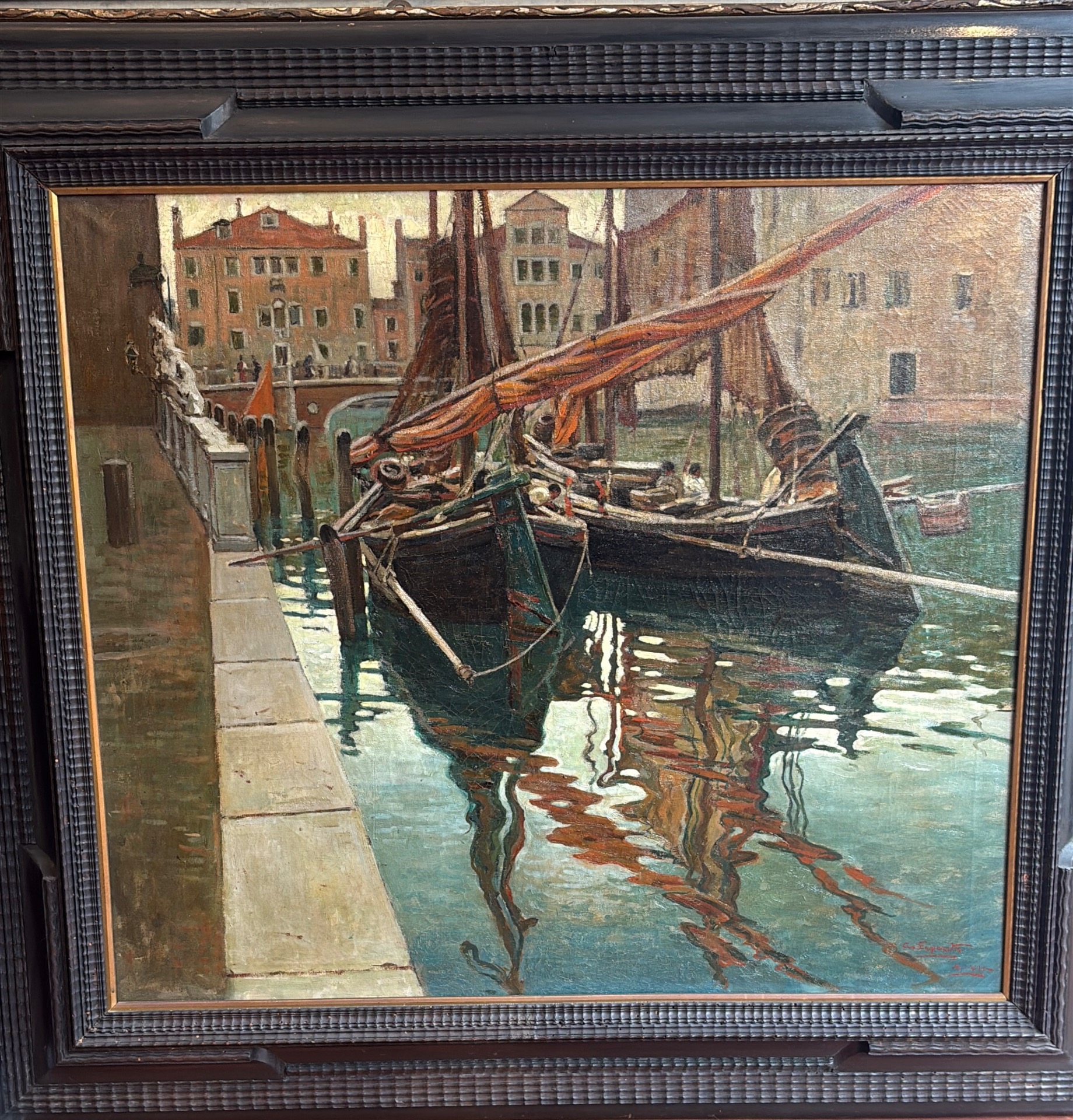 Beautiful seascape with boats and fishermen by Cesare Esposito. Signed and dated 1929 (Year VII). Oil on canvas cm 70 by 80, approx.